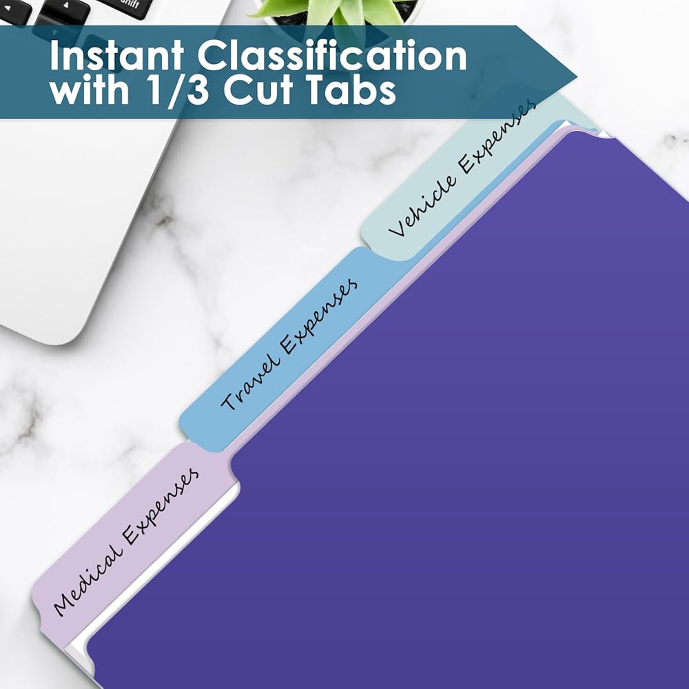 علامة تبويب 1/3 - لسهولة التنظيم والاسترجاع السريع للمستندات. علامات التبويب المقطوعة 1/3 (عدد متساوٍ من علامات التبويب اليسرى واليمنى والوسطى) تجعل من السهل تسمية المجلدات بعناوين ذات معنى وفرز ملفاتك حسب الفئة أو التاريخ أو الأولوية. مثالية لإدارة وتصنيف الأوراق الأكاديمية، ووثائق العمل، والملفات الشخصية، ووثائق العقود، وما إلى ذلك.