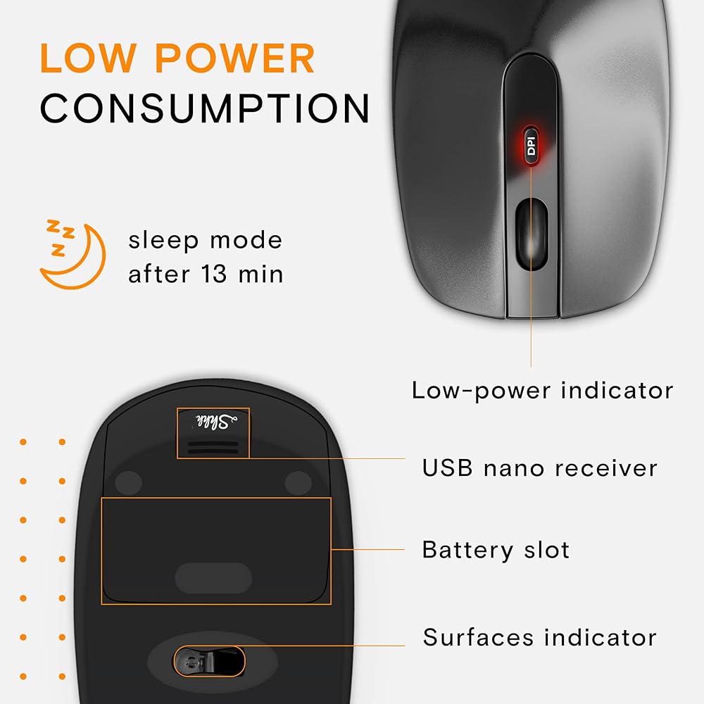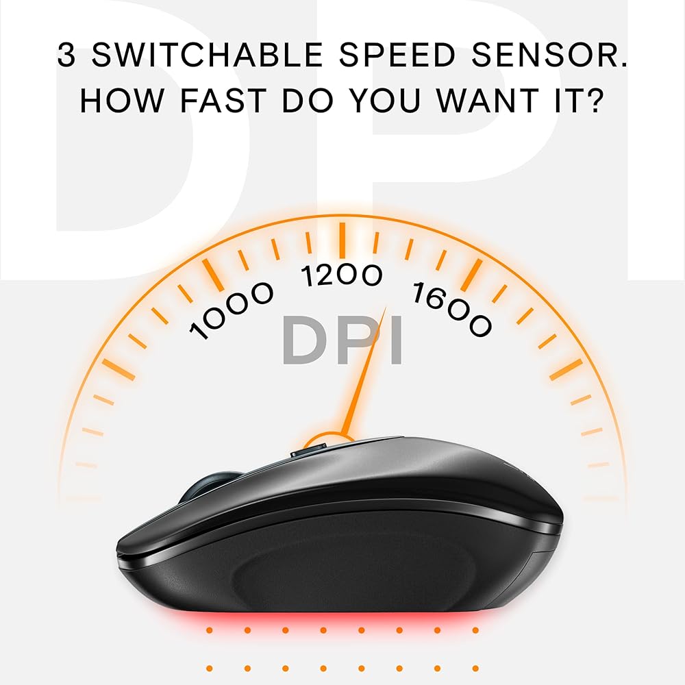 9 نقاط لكل بوصة قابلة للتعديل ونطاق طويل: يمكنك ضبط حساسية المؤشر بسهولة حسب نشاطك - قم بالتمرير من خلال ثلاثة مستويات DPI لراحتك: 1000 و1200 و1600. تسمح التقنية اللاسلكية 2.4 جيجا هرتز بمسافة عمل طويلة تصل إلى 39 قدمًا.