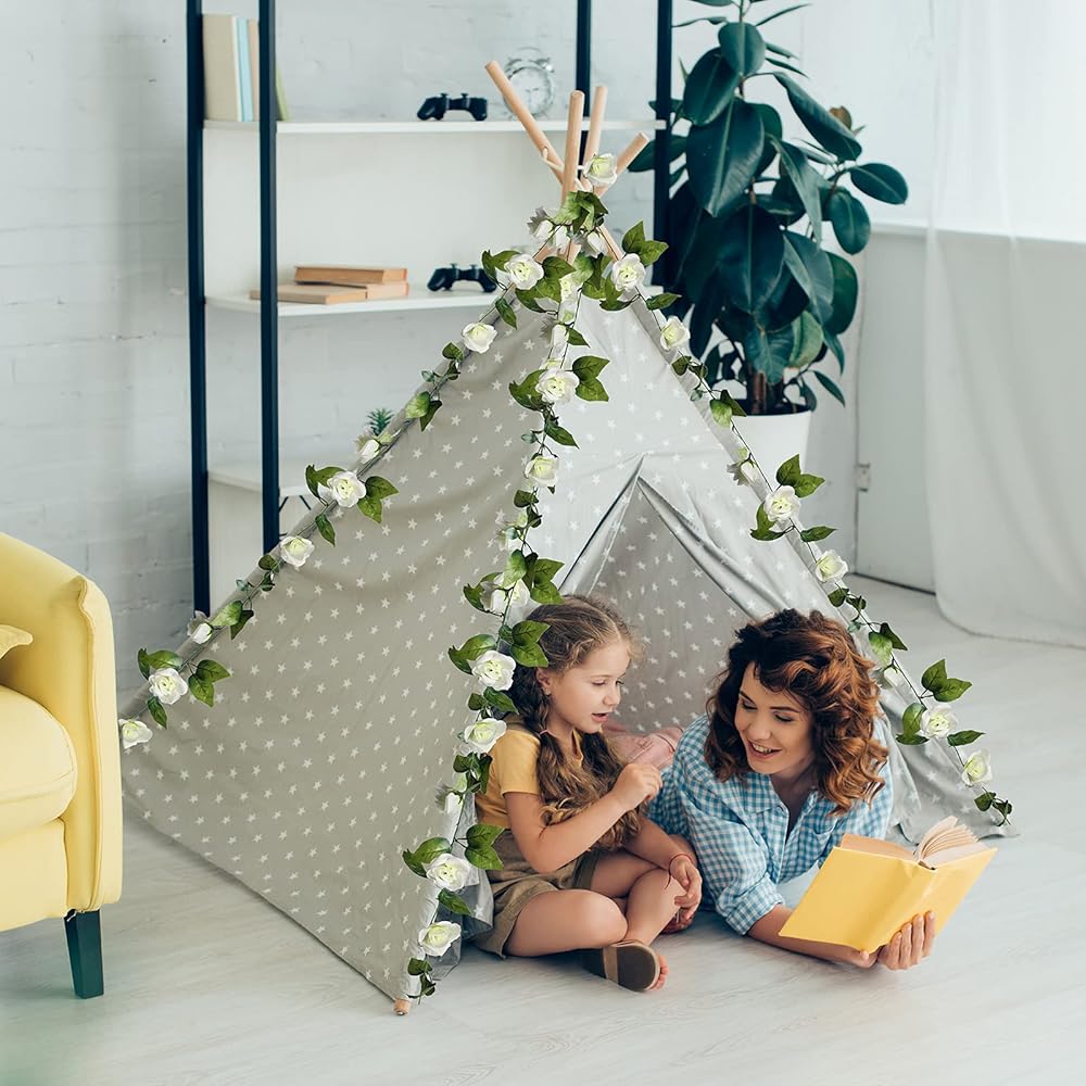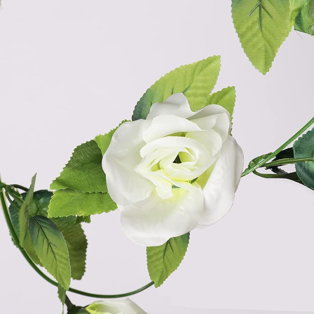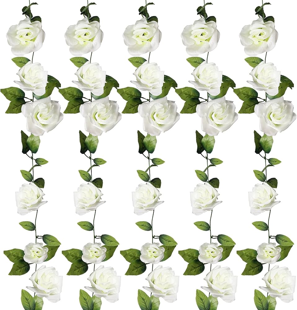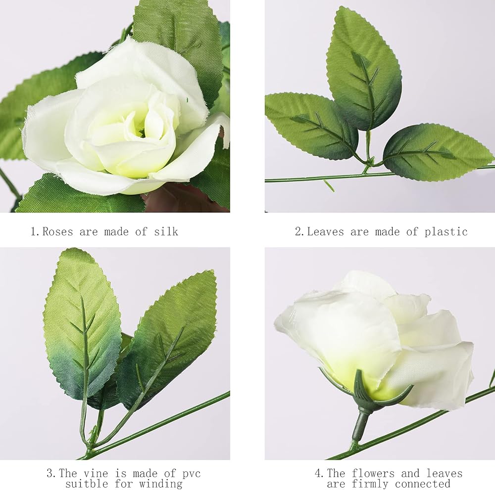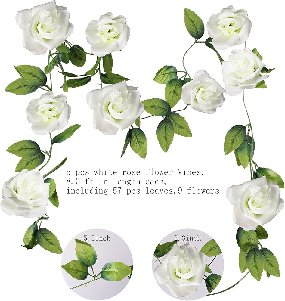 Package includes: 5 pcs white rose flower Vines, Total length 40.0ft,8.0 ft in length each, including 57 pcs leaves,9 flowers.