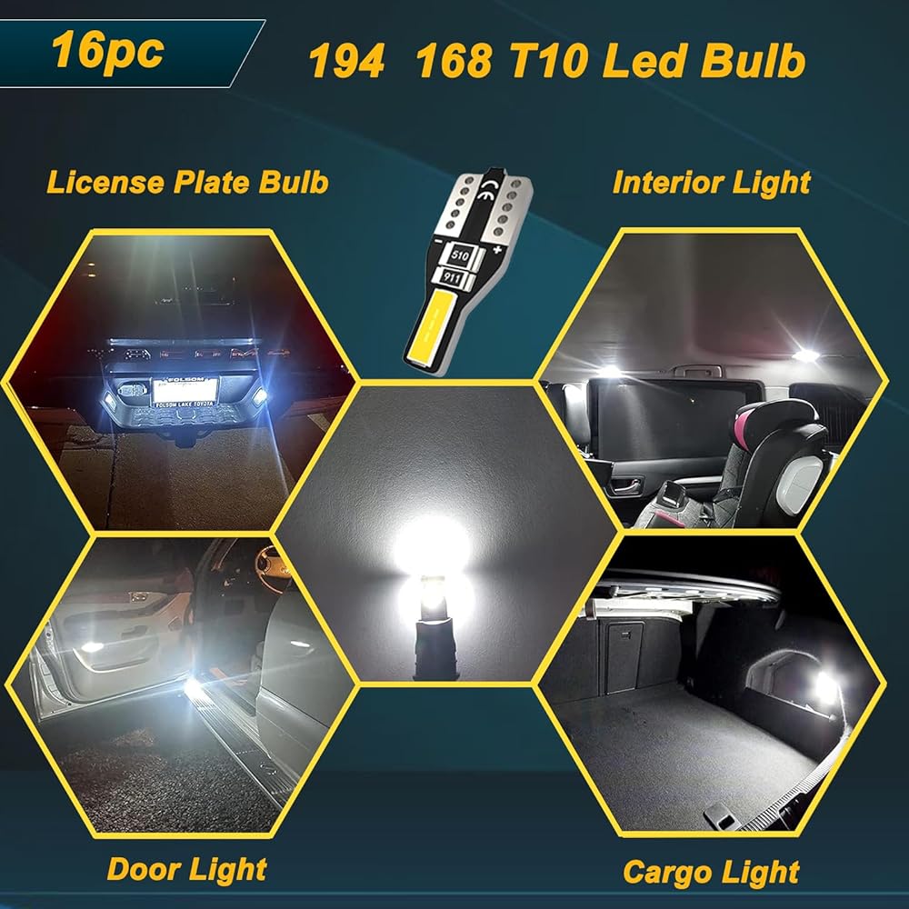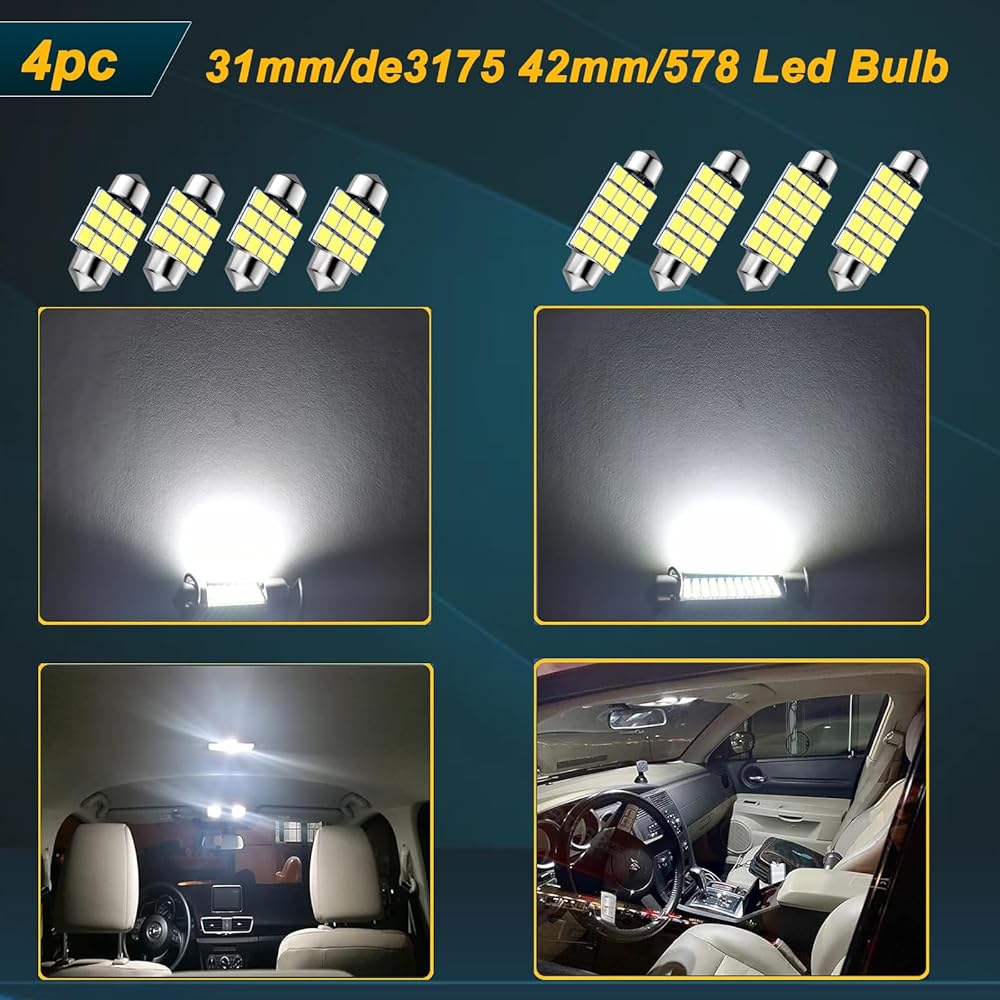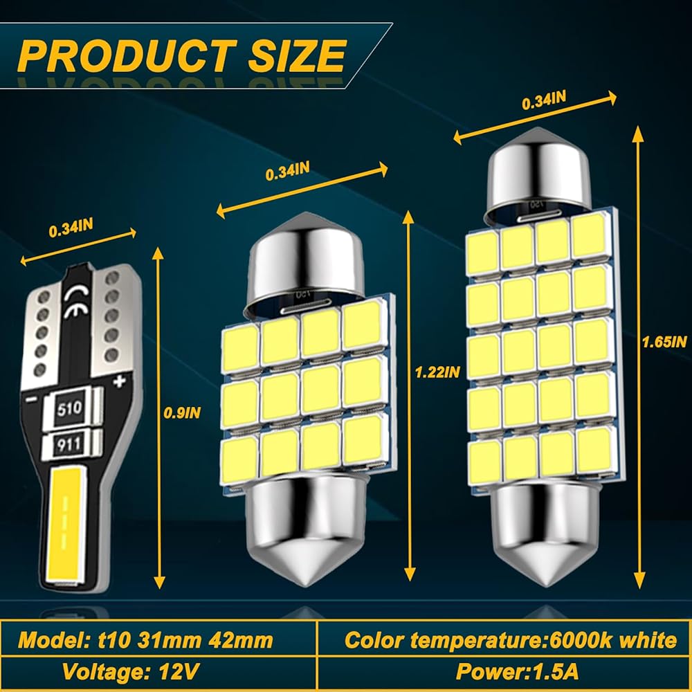تشتمل العبوة على: تحتوي مجموعات مصابيح السيارة الداخلية Led على 16 قطعة 194 t10 مصابيح LED، 4 قطع 31 مم de3175 مصابيح LED، 4 قطع 42 مم 578 مصابيح LED، درجة حرارة اللون لأضواء الخريطة 6000 كلفن، ومصابيح القبة هي DC12V في الجهد الكهربي، 2 وات في الطاقة .