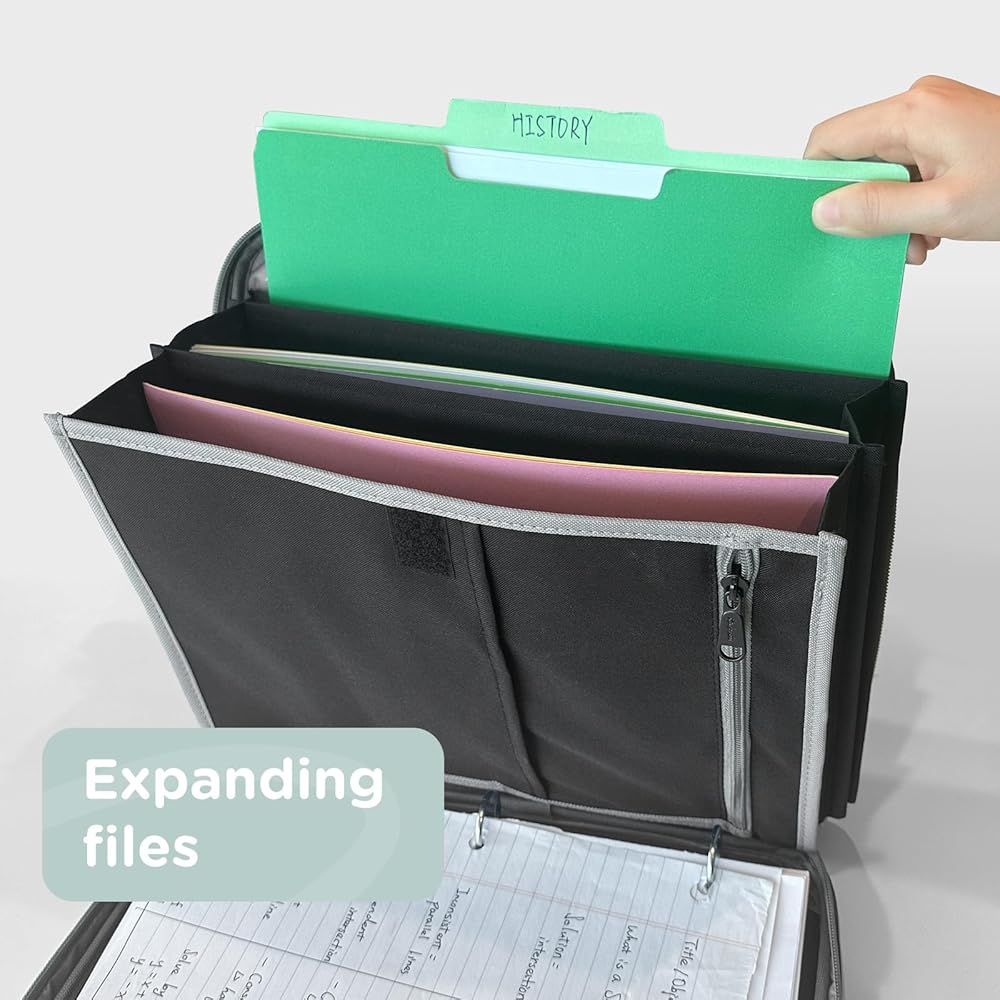 - 4 فواصل مبوبة تسمح لك بتخزين الأوراق وتنظيمها حسب الموضوع. تتلاءم مجلدات الملفات القياسية مع مجلد السوستة بسهولة.