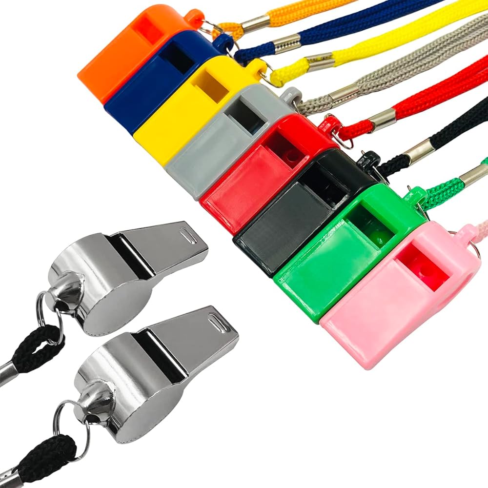8 colored plastic whistles + 2 stainless steel whistles
