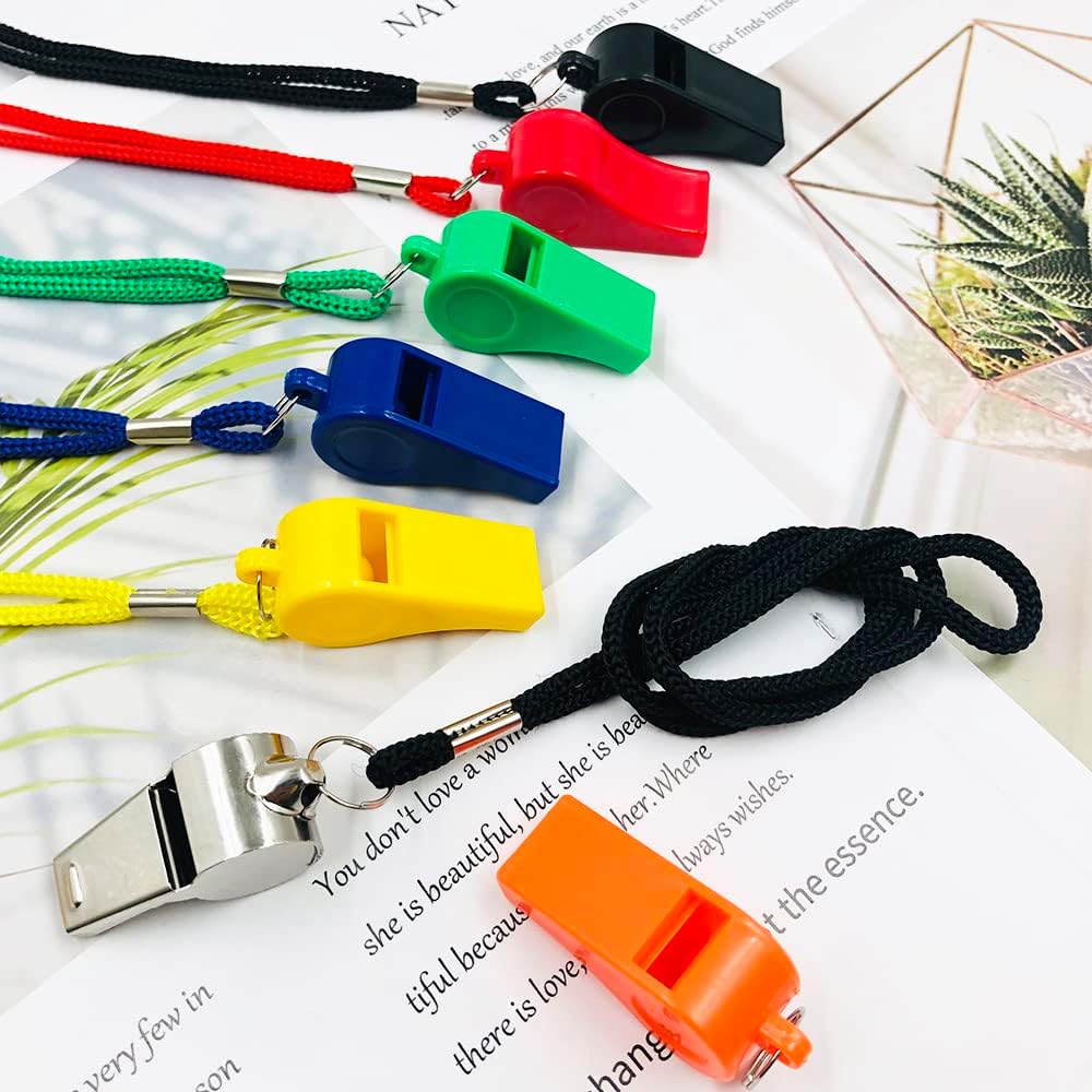 • You will receive: 8 colored plastic whistles with lanyards (red, orange, yellow, green, blue, pink, gray, black) and 2 stainless steel whistles.