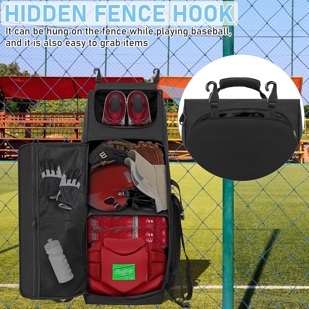 • 🏏【خطافات سياج مزدوجة】: مجهزة بخطافي سياج متكاملين للمخبأ الموجود في الجزء العلوي من الجزء الخلفي من حقيبة مضرب البيسبول، يمكنك تعليق الحقيبة بسهولة والوصول إلى العناصر بسرعة.