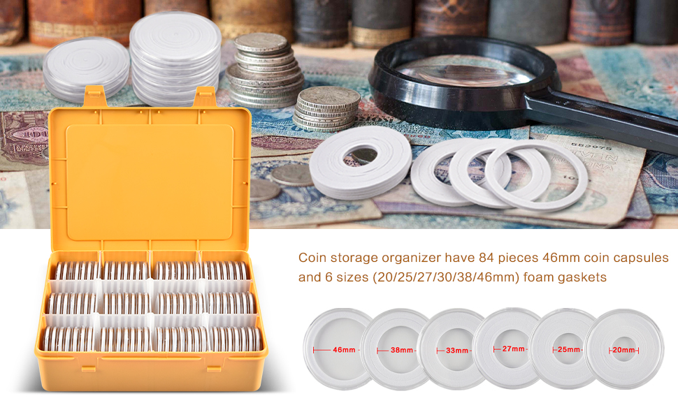 حوامل عملات معدنية عالمية لهواة الجمع: منظم تخزين العملات المعدنية يحتوي على 84 قطعة كبسولات عملات معدنية 46 مم و6 مقاسات (20/25/27/30/38/46 مم) حشوات إسفنجية، 1 صندوق منظم تخزين بلاستيكي (الحجم: 9 * 6.7 * 2.5 بوصة). مناسبة لجمع العملات المعدنية، والدولار الفضي، والبنسات، والربع، والرموز، والميداليات، والشارات، وما إلى ذلك. إنها تلبي احتياجات جامعي العملات المعدنية من لوازم جمع العملات المعدنية، وهي مناسبة لتخزين الأسرة وحملها عند الخروج. (الحالة فقط لا تشمل العملات المعدنية)
