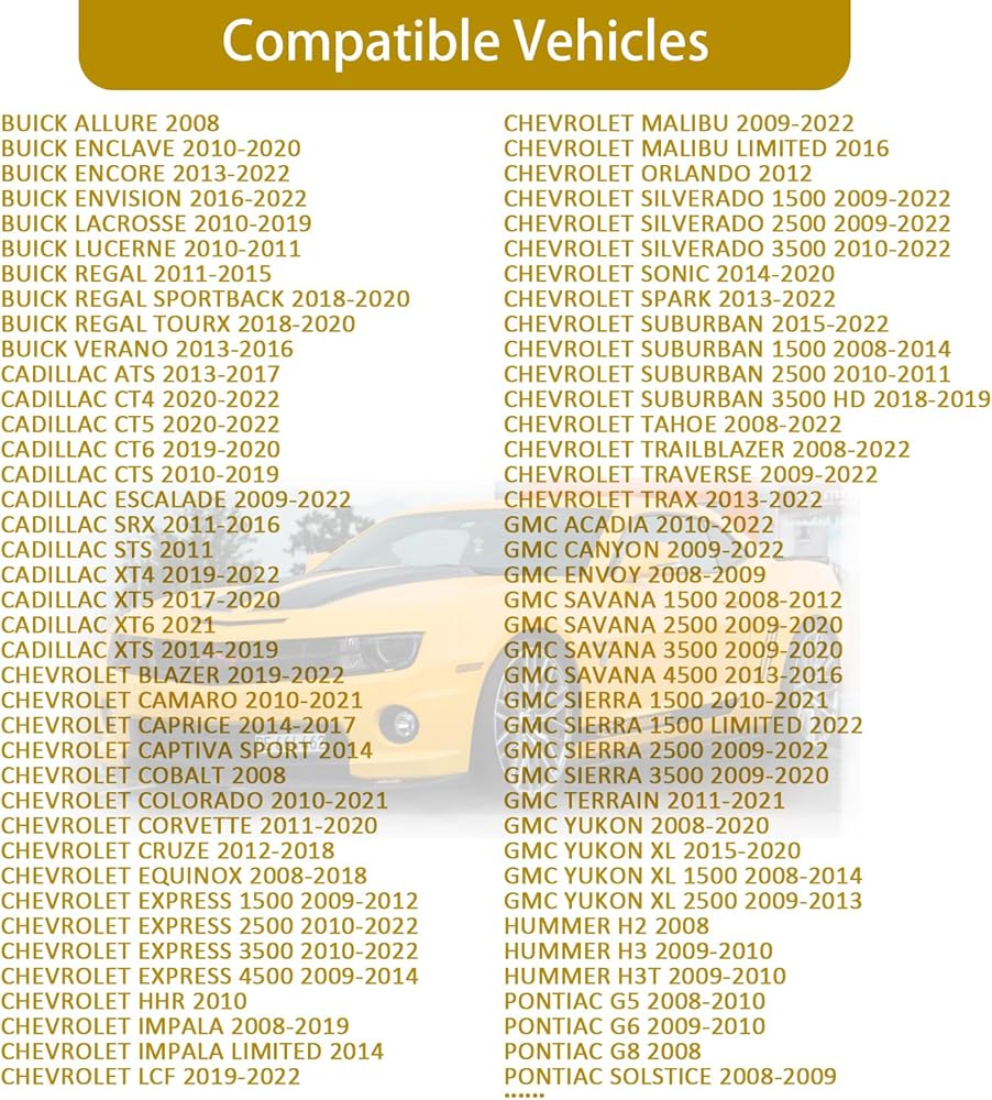 [يستبدل الطراز]: BUICK ALLURE,ENCLAVE,ENCORE,ENVISION... | كاديلاك ايه تي اس،CT4،CT5،CT6... | شيفروليه بليزر، كمارو، كابريس، كابتيفا... | جي ام سي | هامر | بونتياك | ساب | زحل