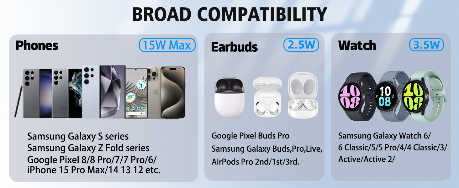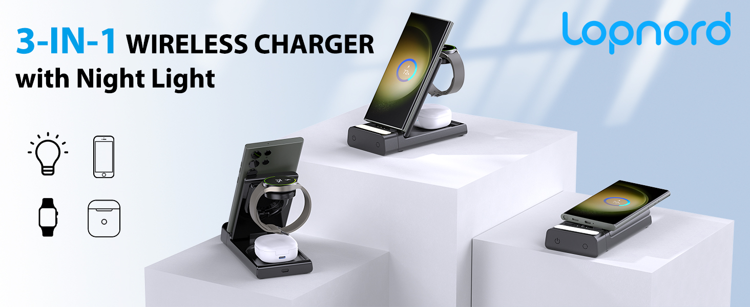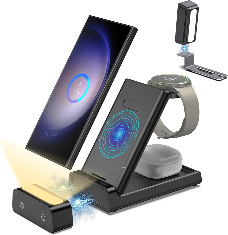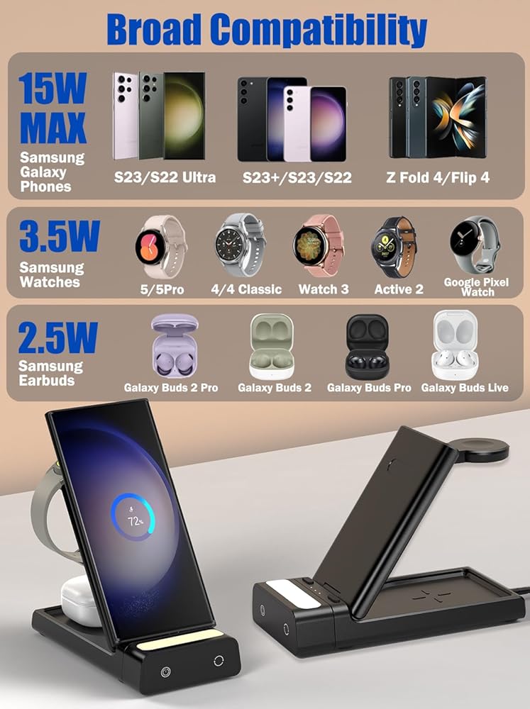 【𝟑 𝐢𝐧 𝟏 𝐖𝐢𝐫𝐞𝐥𝐞𝐬𝐬 𝐂𝐡𝐚𝐫𝐠𝐢𝐧𝐠 𝐒𝐭𝐚𝐭𝐢𝐨𝐧】شاحن Lonord اللاسلكي مصمم خصيصًا لـ سامسونج شاحن أجهزة متعددة. يوفر التصميم الفريد لمحطة الشحن اللاسلكية القابلة للطي 3 في 1 المزودة بإضاءة ليلية طريقة مريحة وفعالة غير مسبوقة لشحن هاتفك وساعة سامسونج وسماعات جالاكسي في وقت واحد. تصميم أنيق وقابل للطي لن يأخذ مساحة كبيرة، ويسهل حمله للمنزل والمكتب والسفر.