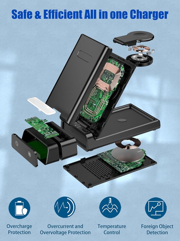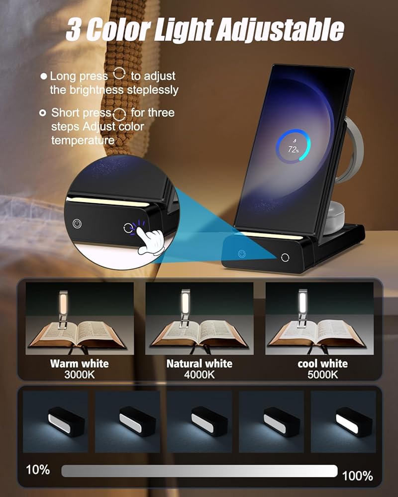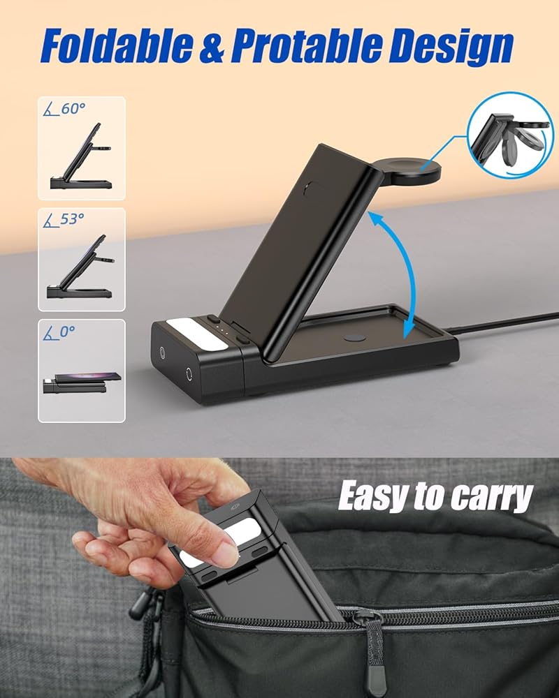 【حامل شاحن لاسلكي 3 في 1 مع إضاءة ليلية يتميز بتصميم قابل للطي، مما يجعله مدمجة وسهلة الحمل. يمكن وضعها بسهولة في حقيبة أو حقيبة سفر، مما يوفر المساحة. تعمل محطة الشحن للمكاتب أو الطاولات الليلية أو للاستخدام أثناء السفر. يمكّنك ضوء مؤشر الشحن LED من التحقق بسرعة من حالة شحن أجهزتك.