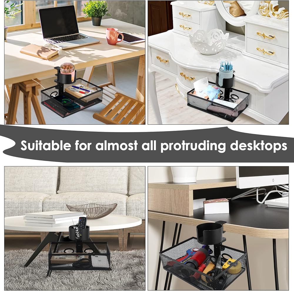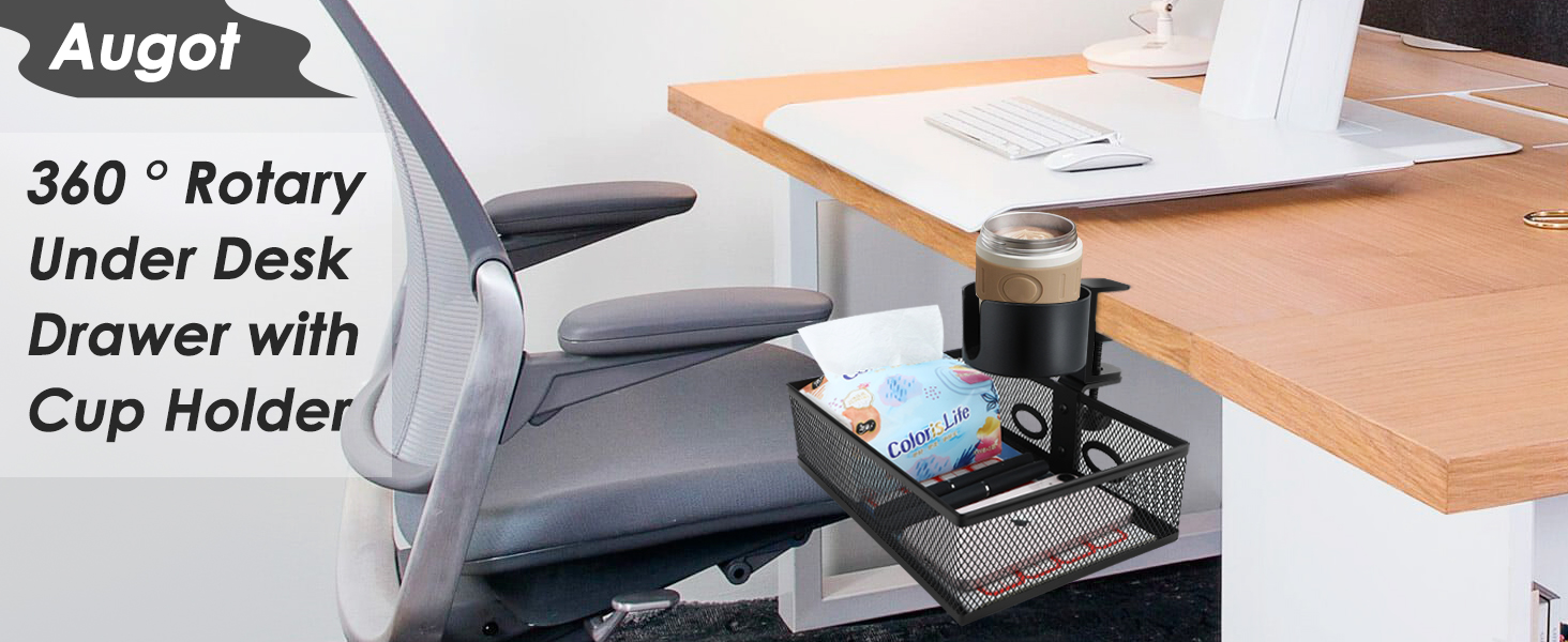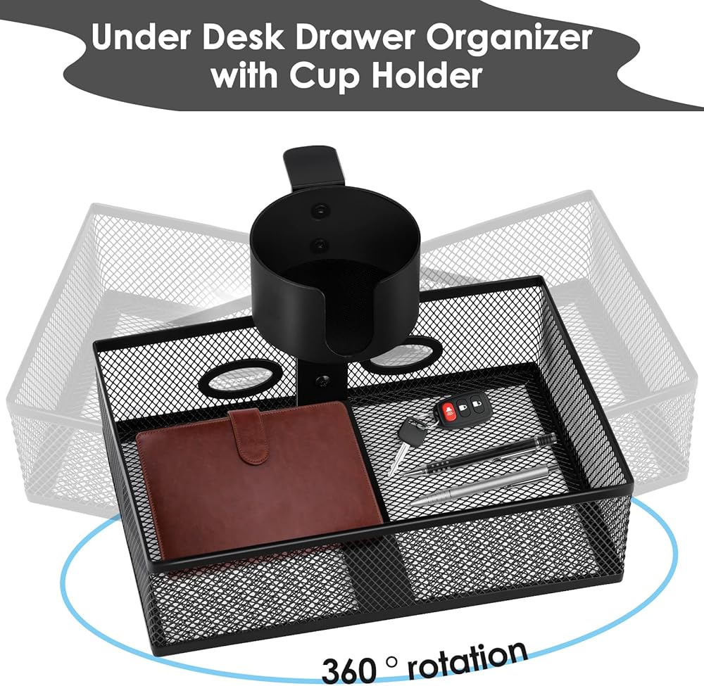 درج أوجوت دوار 360 درجة تحت المكتب مع حامل أكواب، صينية تنظيم درج مكتب 2 في 1، حامل أكواب مكتب مضاد للانسكاب ورف تخزين، صندوق تخزين معدني خالٍ من الثقب لمكتب المنزل مع فتحتين للأسلاك