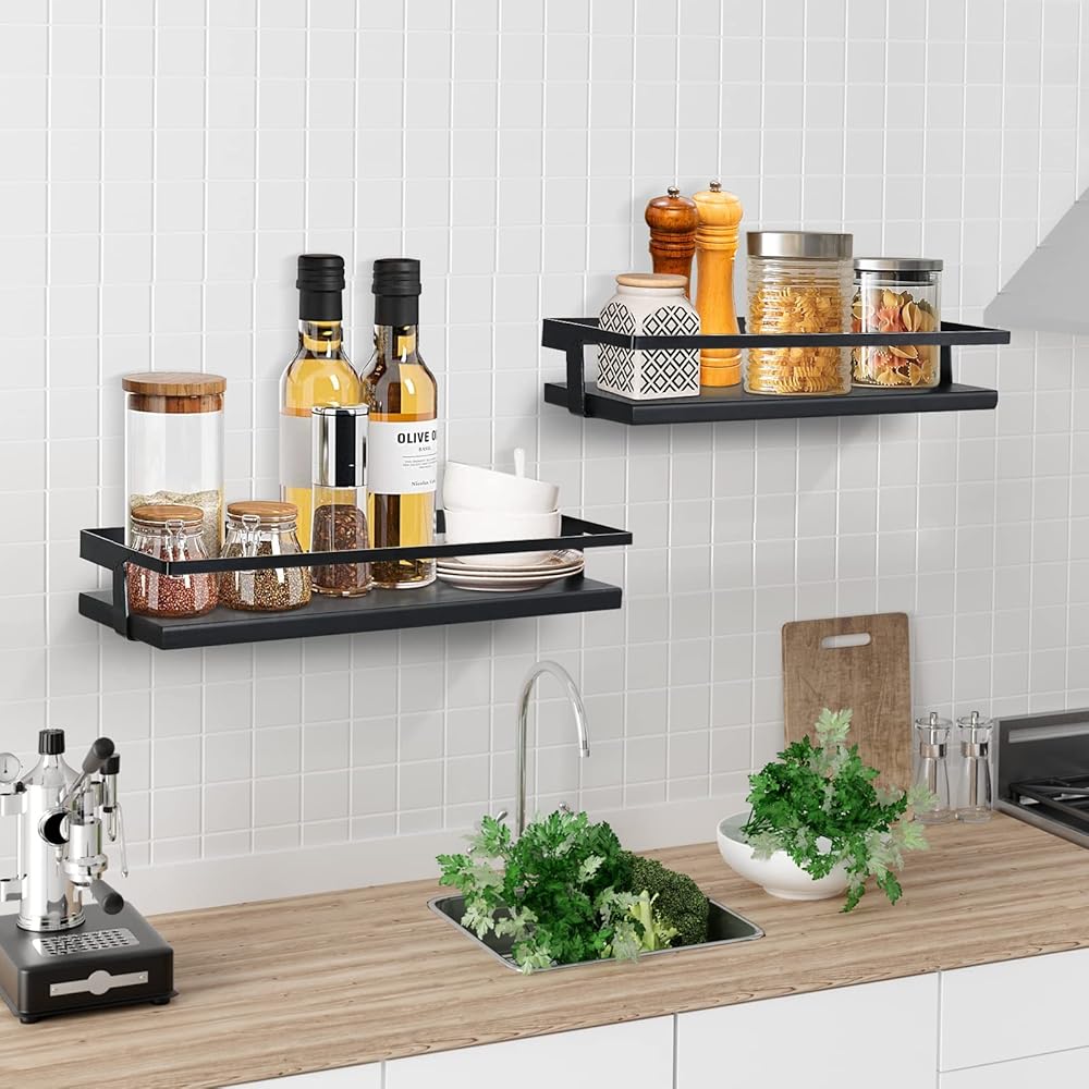 【جودة الرف العائم باللون الأسود】- أرفف المطبخ أو الحمام مصنوعة من مواد خشبية صلبة عالية الجودة ودعامات معدنية مطلية بالمسحوق، أرفف التخزين الجدارية المصنوعة من الخشب الأسود هذه قوية وقوية بما يكفي لاستخدامك اليومي، هذه الأرفف العائمة مقاومة للرطوبة والحرارة. مقاومة. مع حراس وقائية، متينة، قدرة تحمل قوية.
