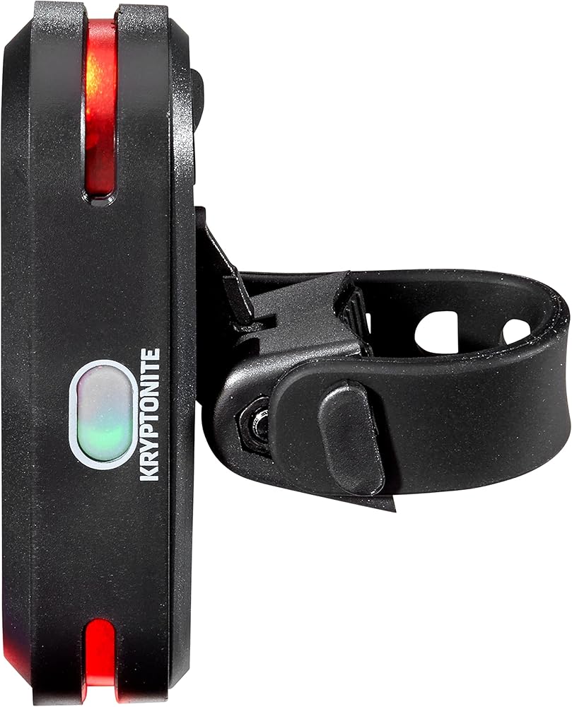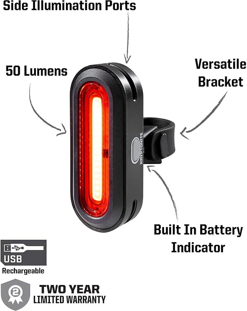 The Kryptonite Avenue R-50 Rear LED Bicycle Light features a lightweight body with a multi-fit quick release system. The ultra-bright COB style LEDs make this small light a great "to be seen" light while riding during the day or night. It easily fits all seat post sizes 10mm to 32mm and grips the bars while riding roads. The quick release strap attachment system makes it easy to take on or off when needed. This light uses a USB rechargeable internal lithium-ion battery. The battery indicator illuminates a red LED when battery life is less than 25% and a green LED when the battery is fully charged. When battery is less than 10%, it automatically drops to economical mode, saving energy and making the light last longer. The compact R-50 is incredibly easy to transport, weighing-in at less than 2 ounces.
