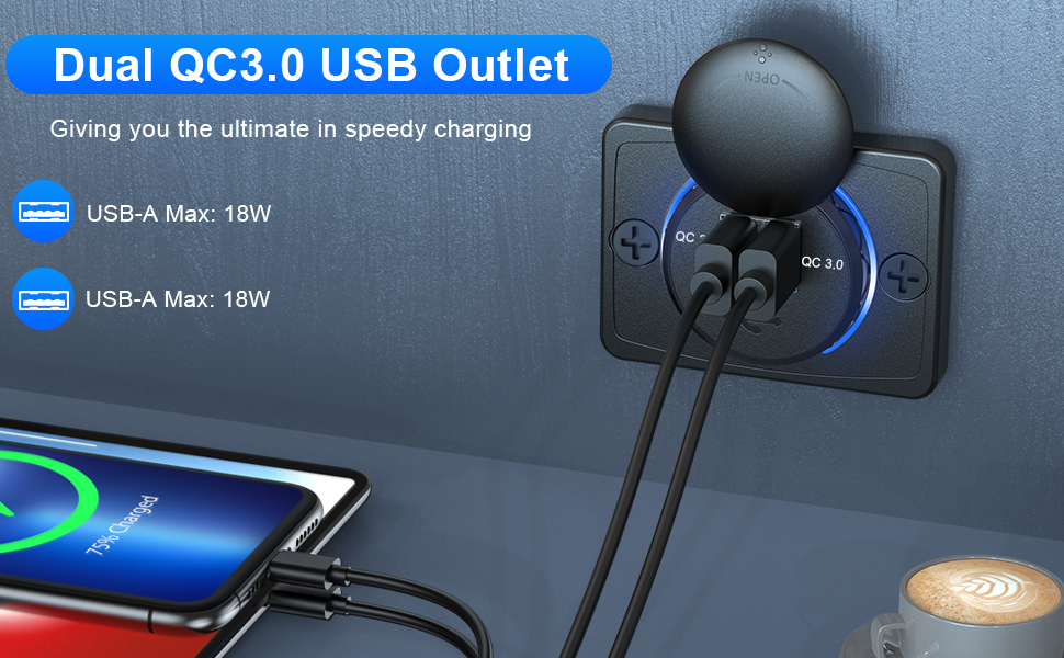 منفذ USB QC3.0 12 فولت - منفذ USB مطور 12 فولت/24 فولت مع توصيل الطاقة ومنفذ شحن سريع 3.0 لشحن الأجهزة أسرع بما يصل إلى 4 مرات من الشاحن الأصلي بقدرة 5 وات بقوة 18 وات كاملة. يمكن أن تدعم السعة الإجمالية لمنفذ USB المزدوج ما يصل إلى 36 وات.