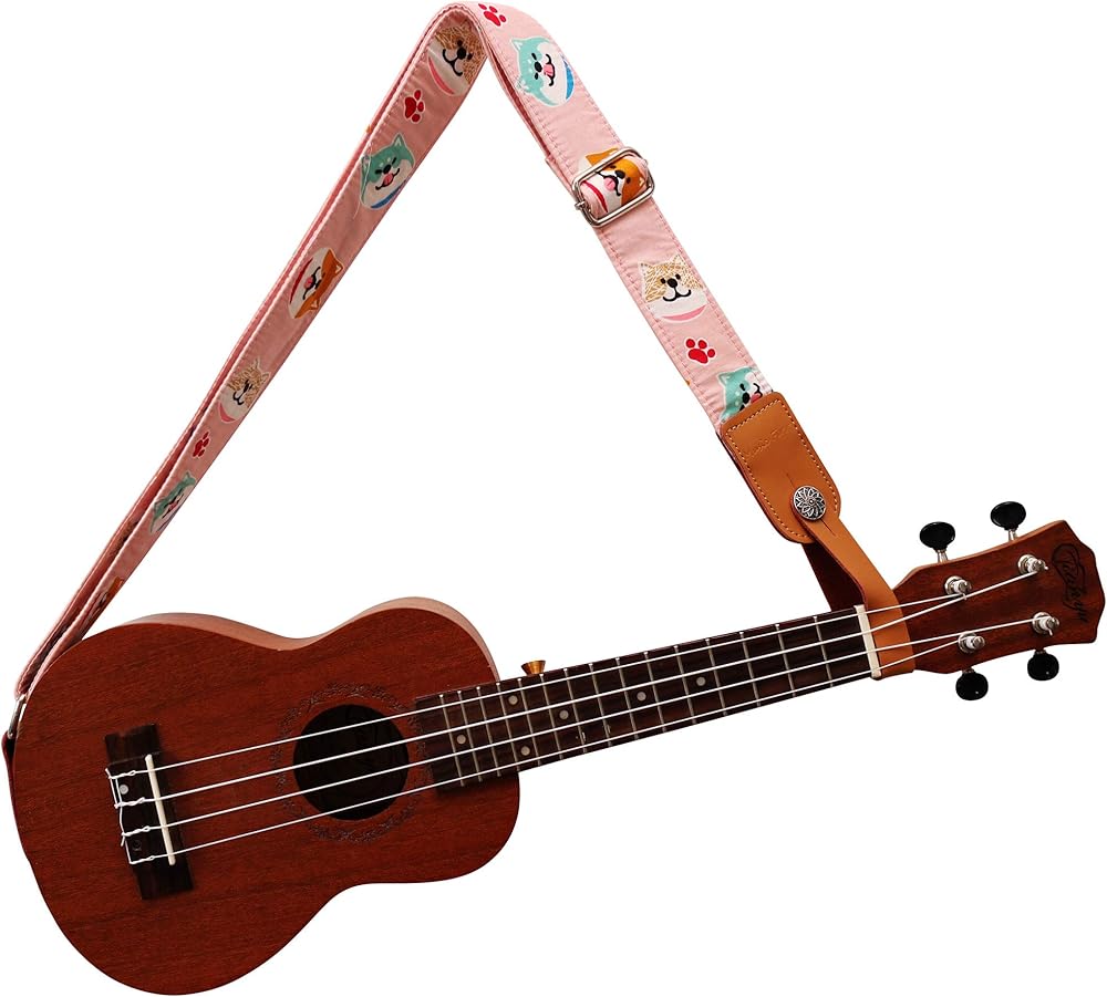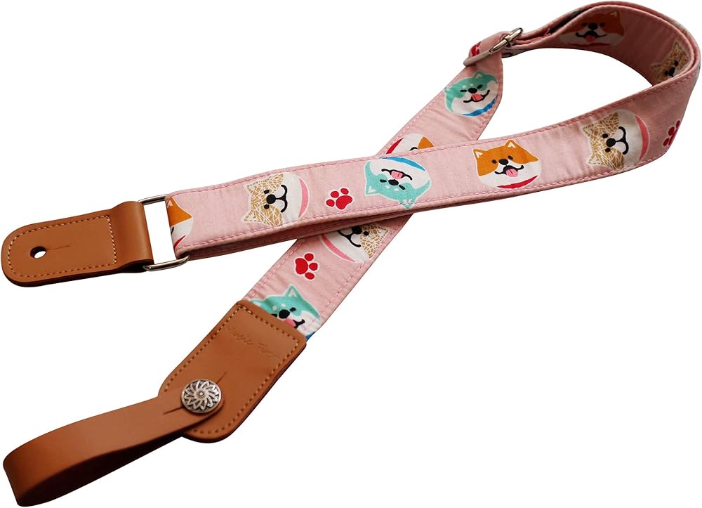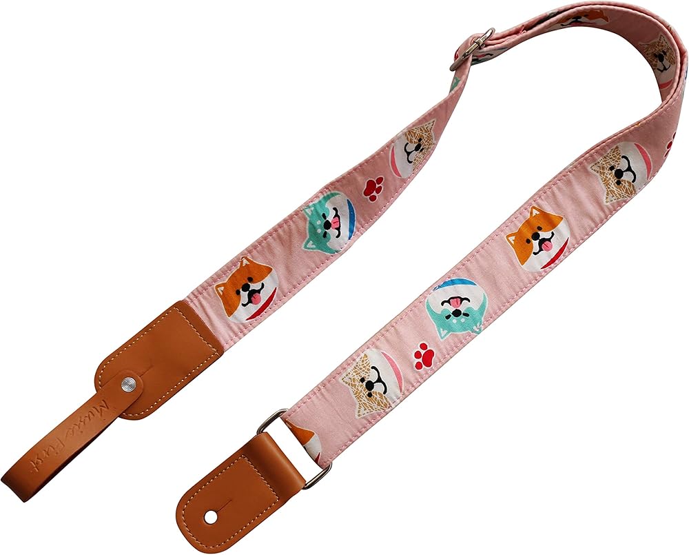 MUSIC FIRST Original Design “Pink Shiba Inu” Soft Cotton & Genuine Leather Ukulele Strap Ukulele Shoulder Strap With a MUSIC FIRST Genuine Leather Strap Locker