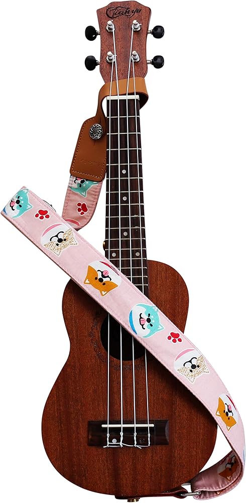 MUSIC FIRST Original Design “Pink Shiba Inu” Soft Cotton & Genuine Leather Ukulele Strap Ukulele Shoulder Strap With a MUSIC FIRST Genuine Leather Strap Locker / Beautiful Pink Shiba Inu patterned Cotton Strap with Genuine Leather Strap End (Since the fabric of the strap is cut from a big piece of fabric, the pattern of each strap will be a little different, That means your strap will be unique!) / Material: Cotton (out side) + Genuine leather+ Cotton (inner side)+Metal Accessories / Width: 1.5inch (3.8cm); Length: 48inch ~ 27.5inch (122cm~70cm) adjustable; Thickness: 0.13inch (0.33cm) / One piece of MUSIC FIRST Ukulele Strap Locker (Worth $7.99) + One Golden color strap nail included. (The ukulele in the picture is not included)