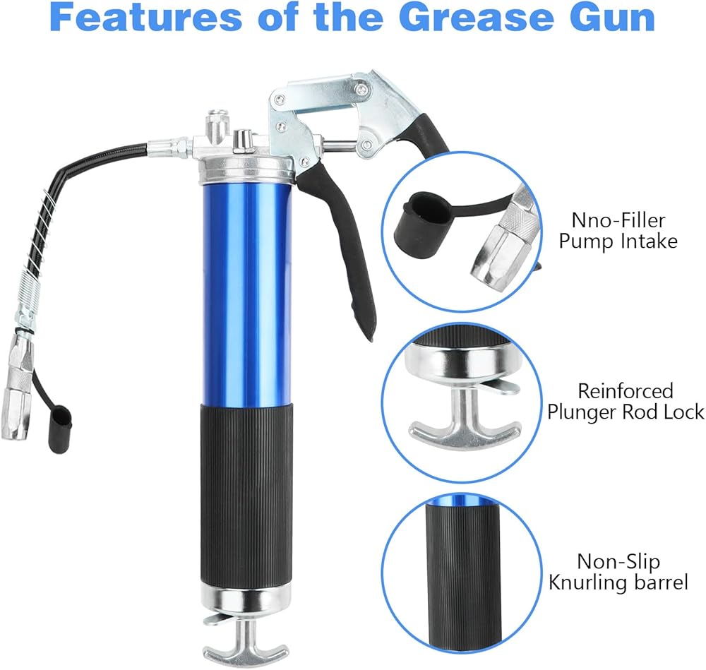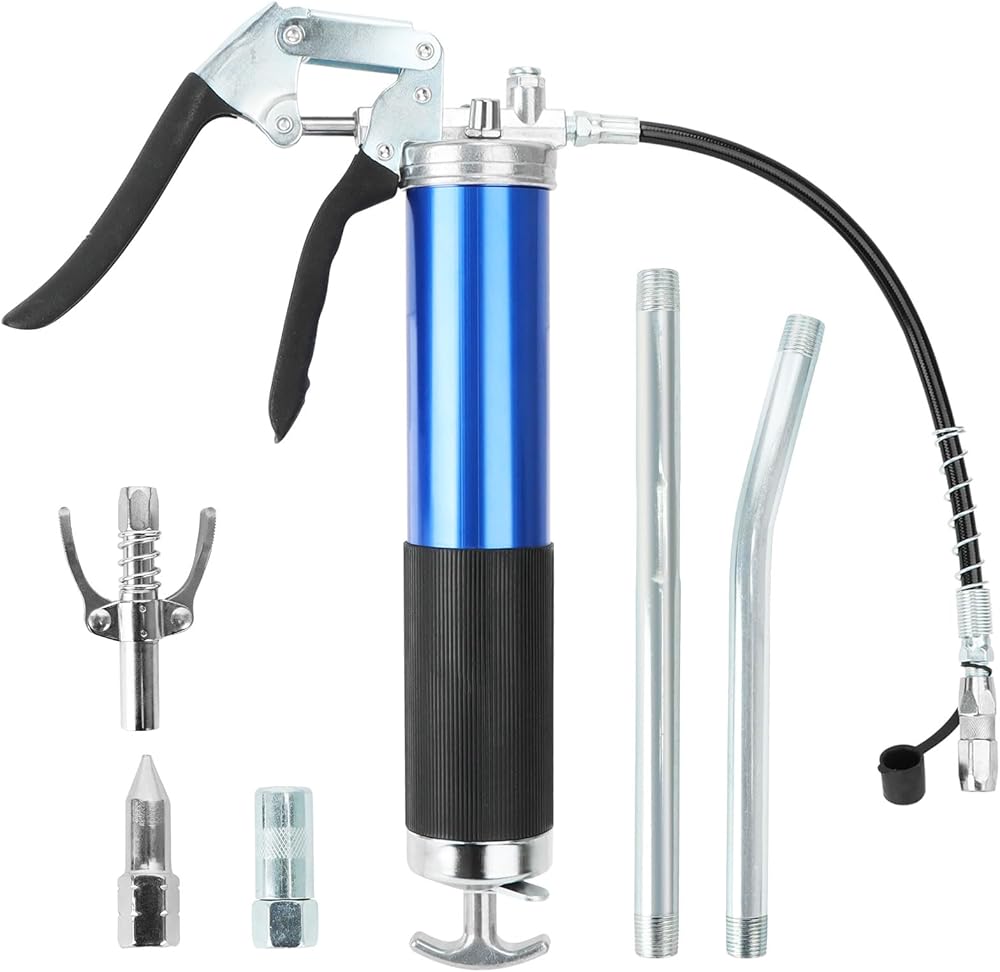 مجموعة مسدسات الشحوم ذات قبضة مسدس شديدة التحمل YOTINO 6000-7000PSI، سعة تحميل 14 أونصة مع خرطوم مرن زنبركي 18 بوصة، 1 وصلة قفل، 1 وصلة معززة، 1 فوهة من النوع الحاد، 2 أنبوب صلب تمديد