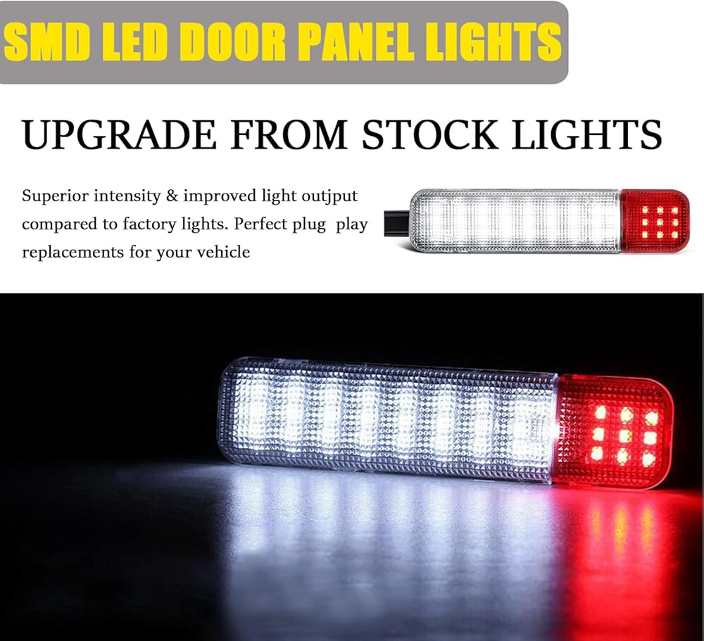 2 قطعة من المصابيح العاكسة للوحة الباب الداخلية، ضوء باب جانبي LED عالي السطوع، متوافق مع شيفروليه، طاهر، سيلفرادو، سابان، جي إم سي، كاديلاك، هامر (أبيض وأحمر)