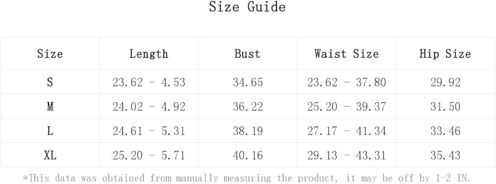 XL:Bust:40.2IN,Hip Size:35.4IN,Length:25.2/5.7IN,Waist Size:29.1-43.3IN