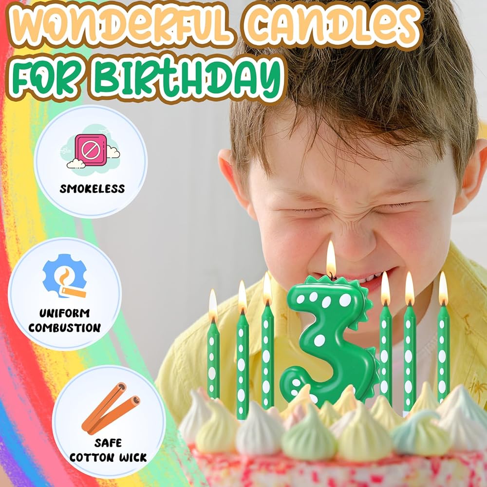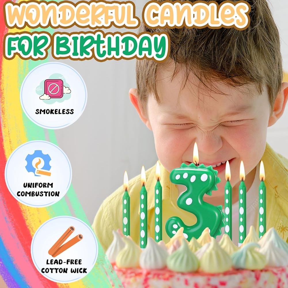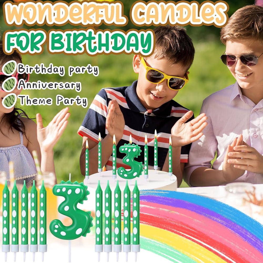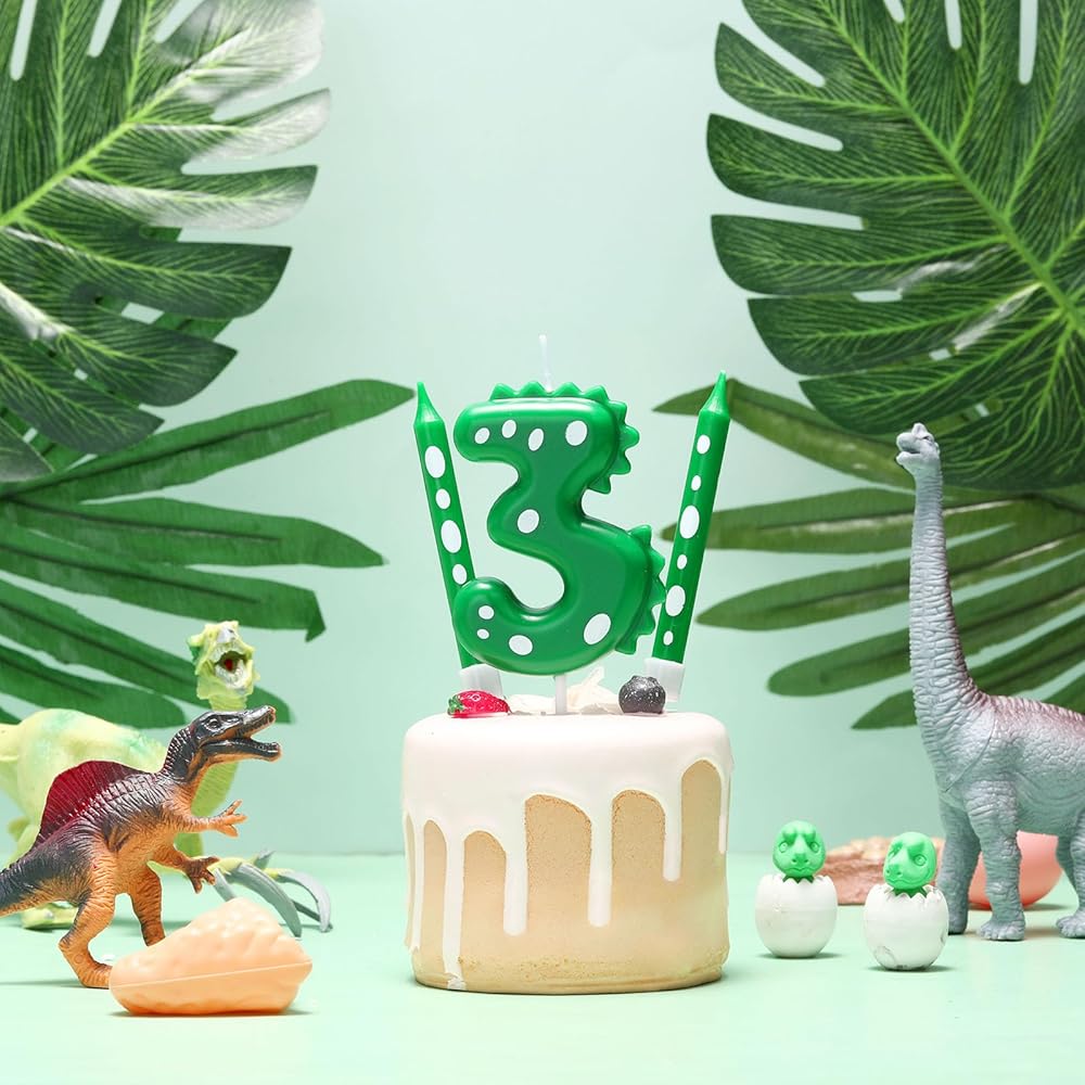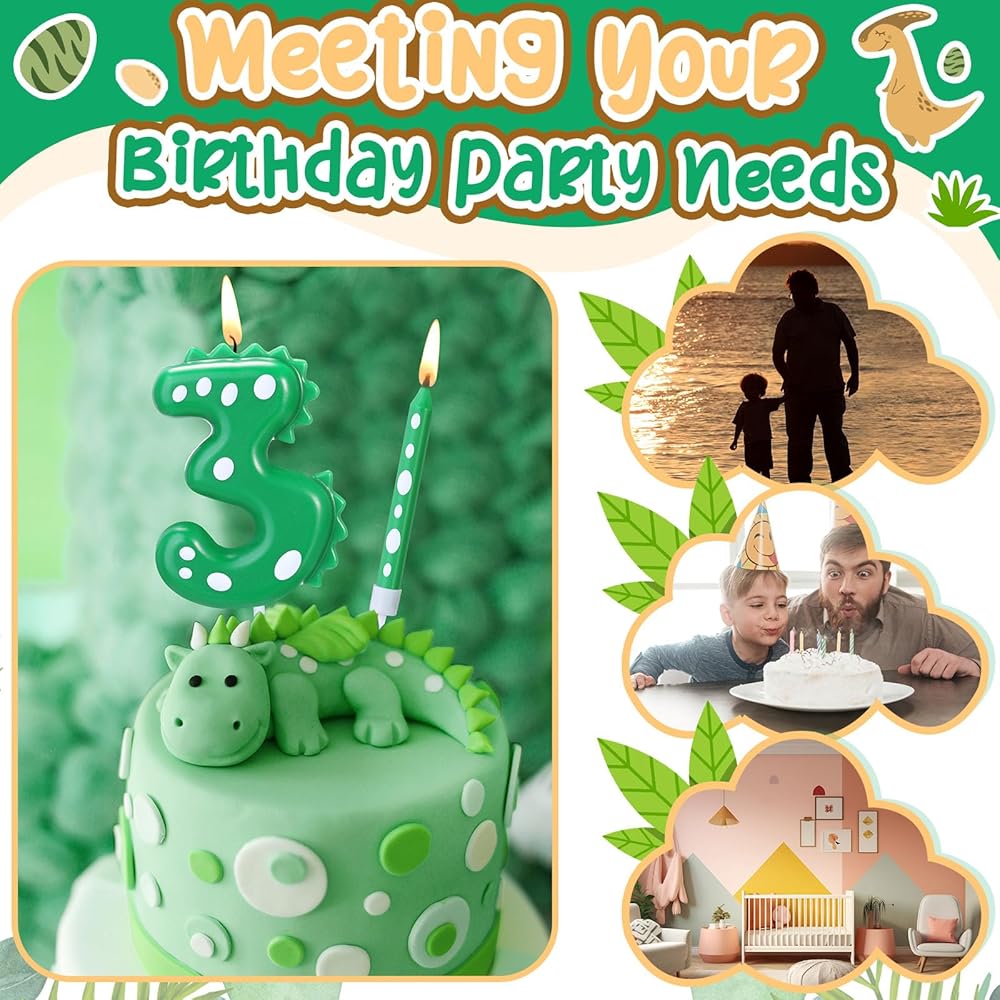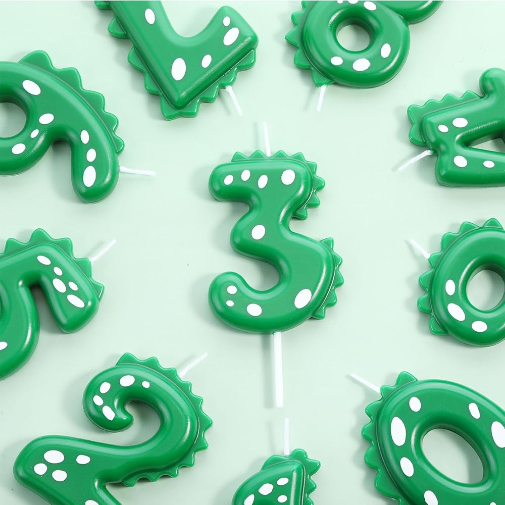 Features: Cute design: Our green numbers candle is designed in the dinosaur shape, cute and novel, easily loved by kids and adults. These candles are suitable for cake decoration, matching with other dinosaur theme decorations to create more atmosphere for a birthday party. Multiple uses: The birthdays candles can be applied not only as normal candles, but also an ornament. You can use these candles to decorate your cake and take pictures to memory the happy day. Specifications: Size: 2.6 x 1.8 Inches. Number candle: approx. 2.6 x 1.8 Inches. Long thin cake candles: 3.7 inches in height Material: paraffin Color: green Quantity includes: 1 x Number Candle 10 x Long Thin Candles Notes: Candles should be stored in a cool and dry place when not in use, away from fire, and away from children when burning. Manual measurement, please allow slight errors on size. Keep our products out of skin contact and away from children.