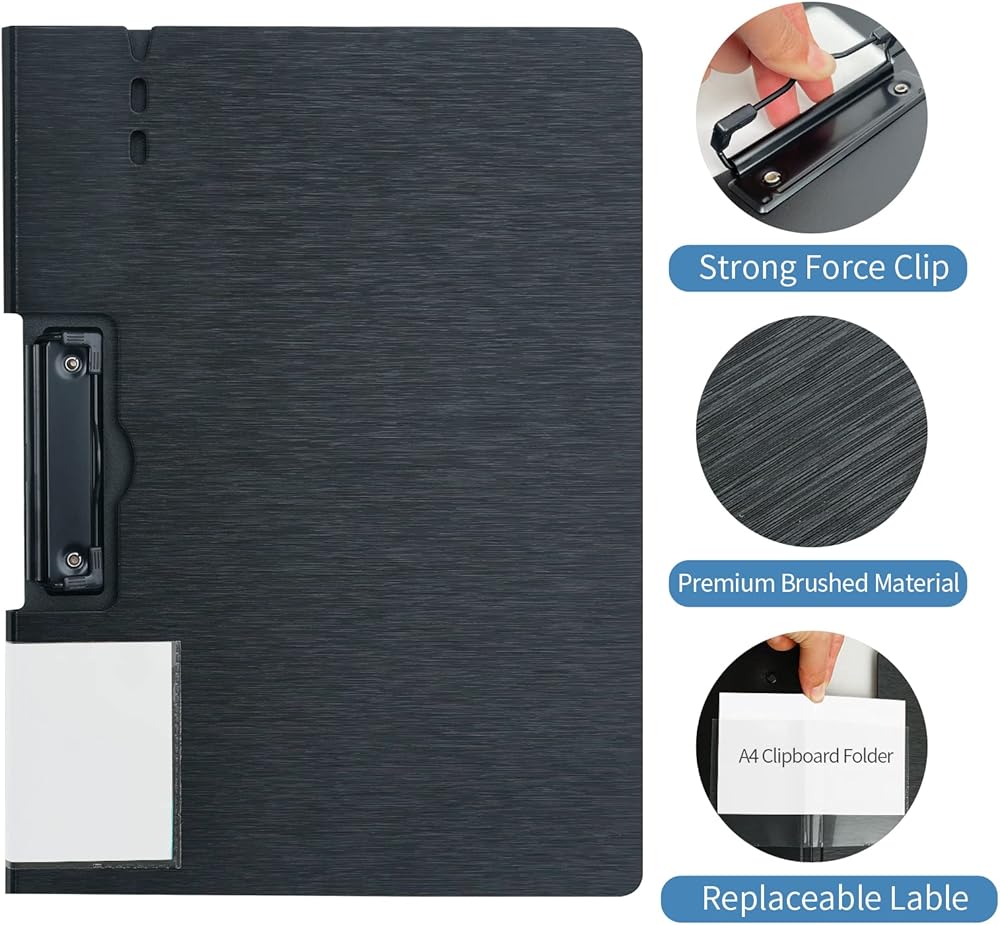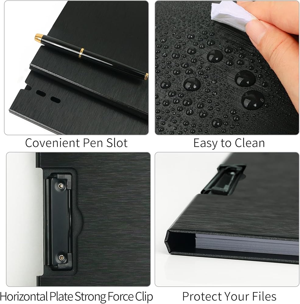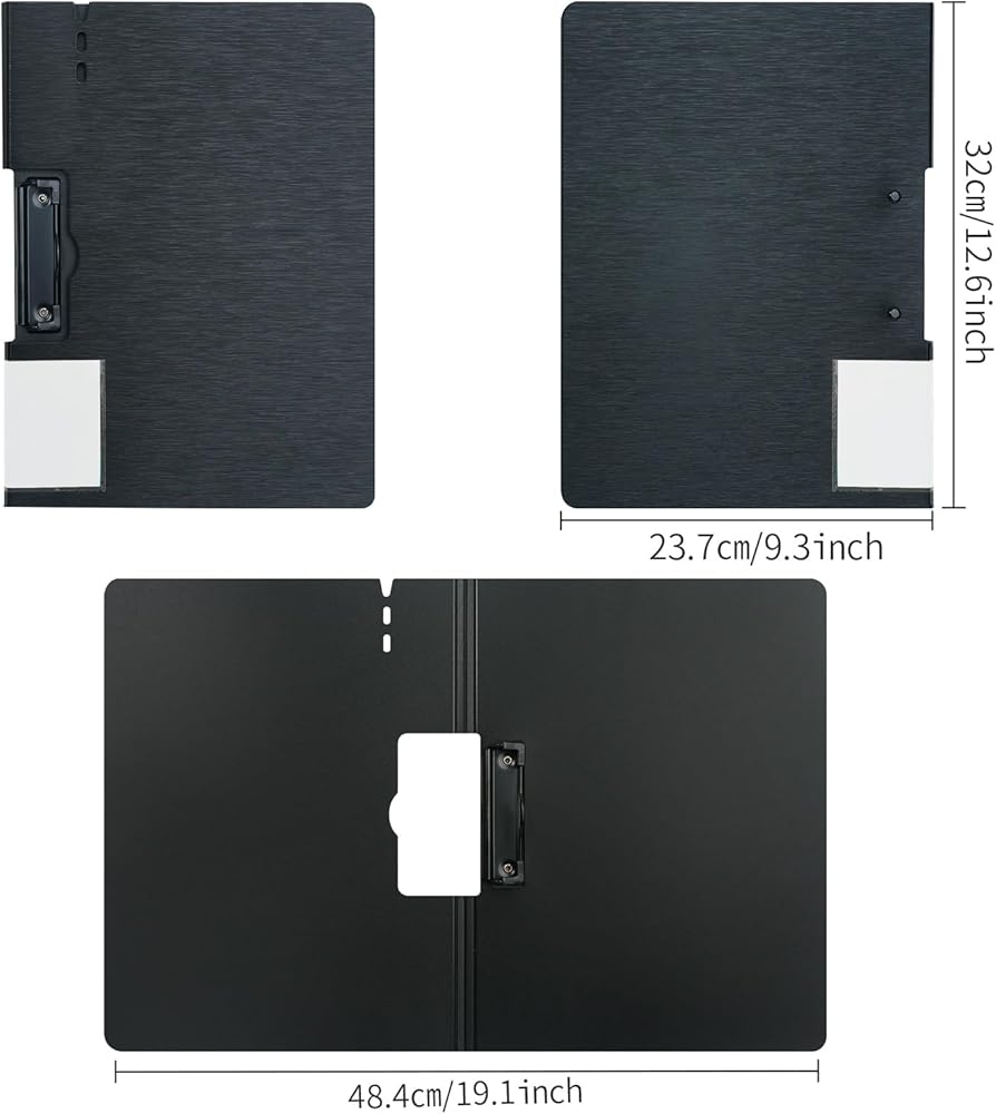 • حجم A4: حجم الحافظة هو 48.4 × 32 سم / 19 × 12.6 بوصة. يمكن بسهولة إصلاح ما يصل إلى 80-100 ورقة من ورق A4، تصميم حامل القلم مناسب لتخزين القلم وتسجيل المعلومات المهمة في أي وقت، مشبك تعليق مخفي جعلها أسهل للتخزين