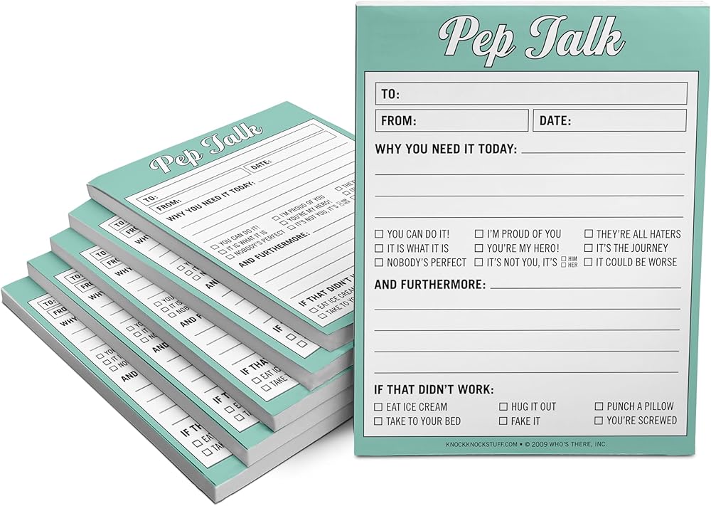 No one likes to be bummed out, but everybody drags from time to time-and that's why God invented pep talks. Turn those frowns upside down with this paper picker-upper-good cheer guaranteed! Encourage the easy way. Knock Knock is an award-winning purveyor of witty books and gifts. Our mission is to create products that bring humor, function, organization, and design to everyday life.