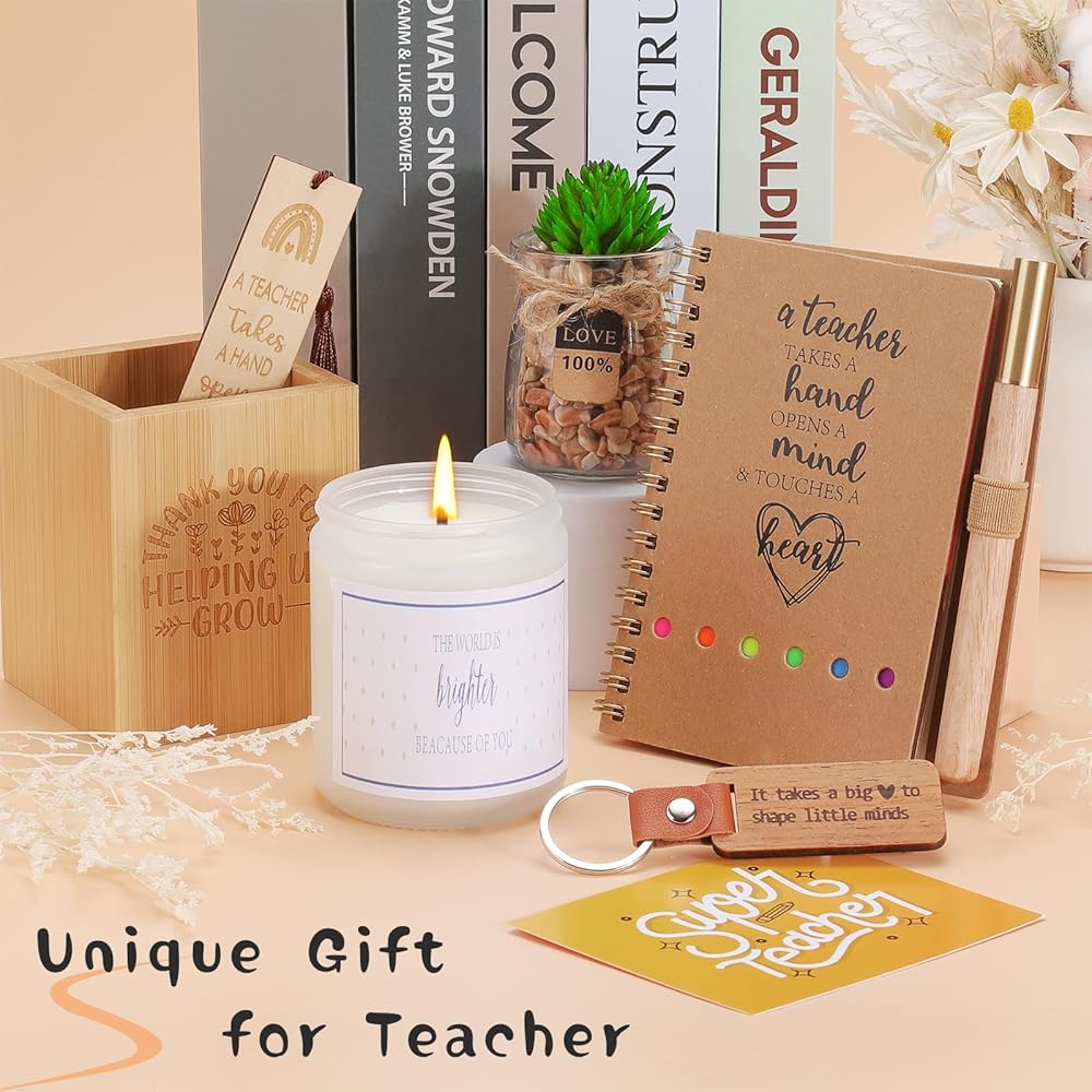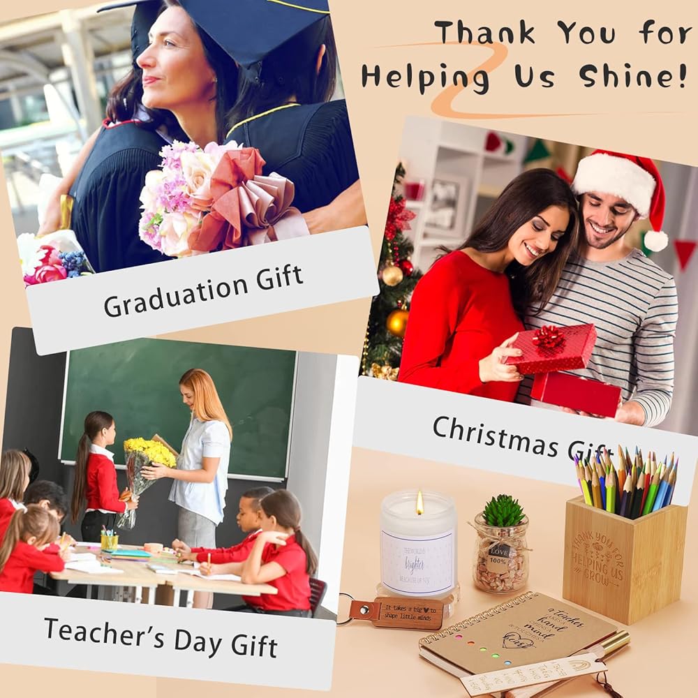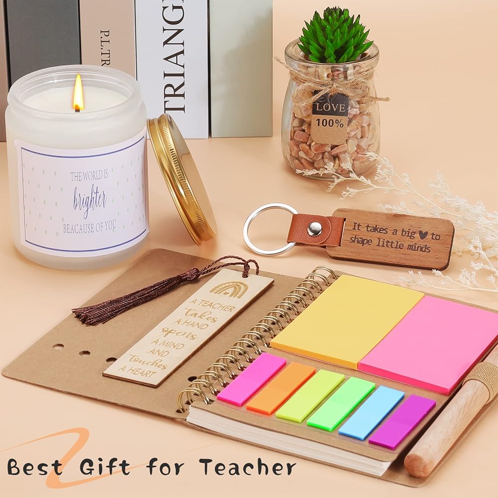 【هدايا تقدير المعلم】 تتضمن مجموعة هدايا المعلم الرائعة هذه مجموعة من العناصر العملية والجميلة، مثل الشموع المعطرة، والدفاتر ذات الملاحظات اللاصقة، وحاملات الأقلام الخشبية، والعصارات المحاكاة، والإشارات المرجعية الخشبية، وسلاسل المفاتيح الخشبية، وبطاقات الشكر. مع هذه الهدايا المدروسة، سيشعر معلمك بتقديرك واهتمامك في عمله وحياته اليومية.