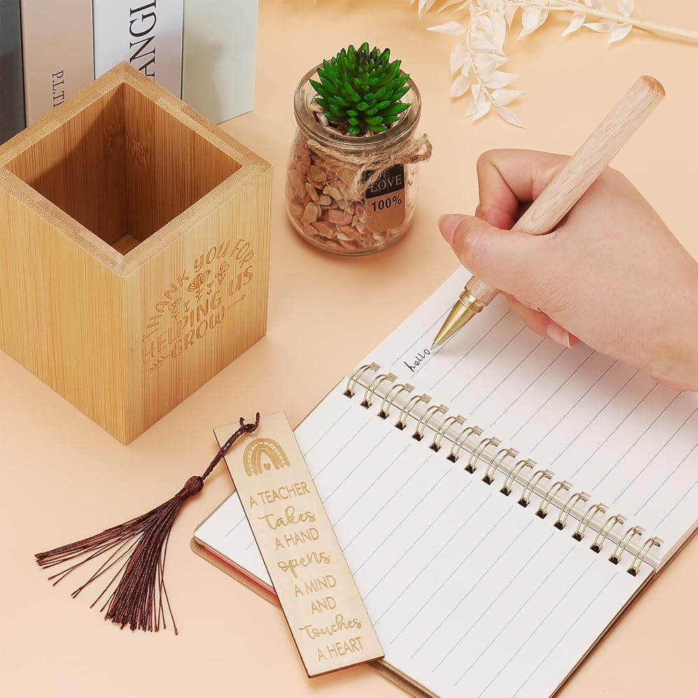 【دفتر ملاحظات مبتكر وحامل أقلام خشبي】يتميز دفتر الملاحظات الموجود في مجموعة الهدايا هذه بغطاء مطبوع عليه رسالة امتنان تجاه معلمك، ويأتي مع ملاحظات لاصقة وقلم حتى تتمكن من تدوين الملاحظات والأفكار المهمة بسهولة. لا يساعد حامل القلم الخشبي في الحفاظ على مكتبه منظمًا فحسب، بل يوفر أيضًا مساحة تخزين أنيقة للأقلام والأدوات المكتبية الأخرى.