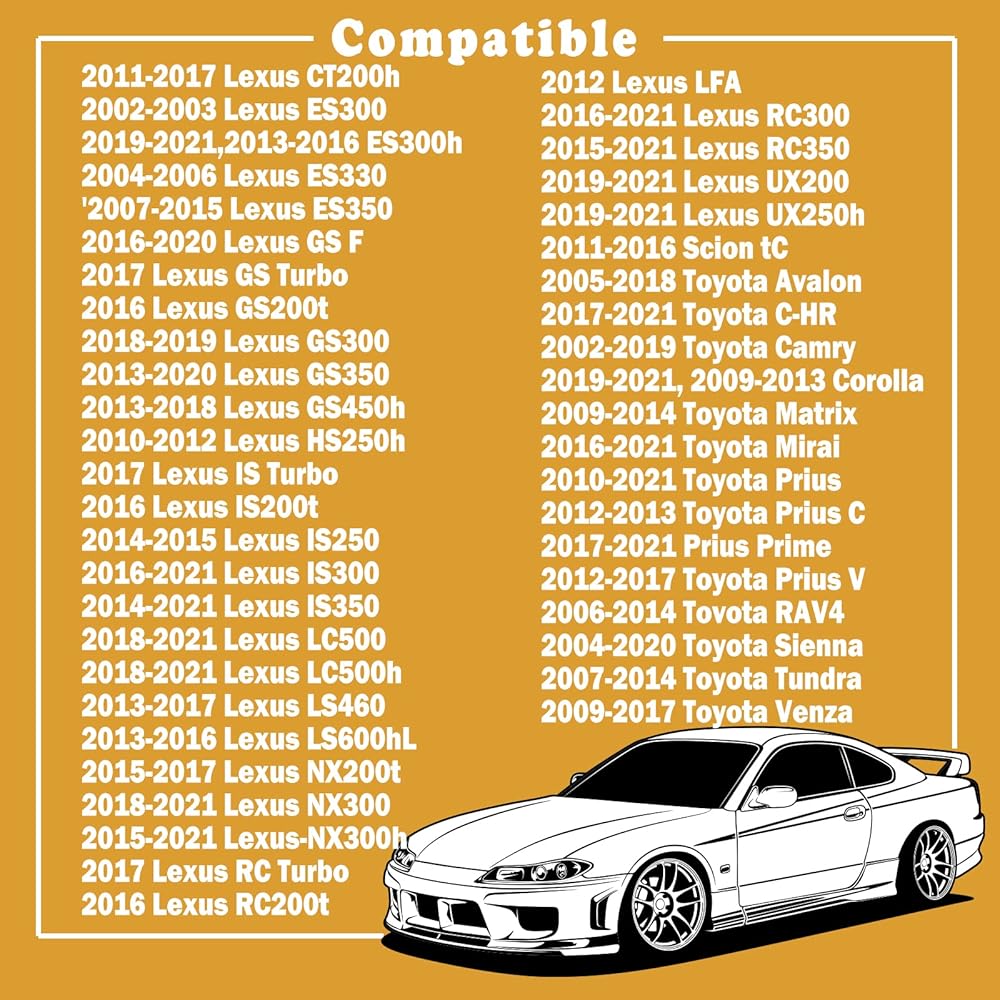 • متوافق مع لكزس: ES300، ES300h، ES330، ES350، GS F، HS250h، IS200t، IS250، IS300، IS350، NX300، NX300h، RC F، RC200t، RC300، RC350، UX200، UX250h.