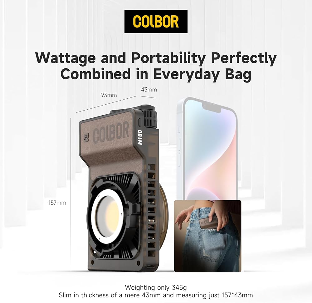 • بوزن 345 جم فقط، وسمك نحيف يبلغ 43 مم فقط وقياس 157*43 مم فقط، يتحول COLBOR W100 من شكل الأسطوانة إلى لوحة مسطحة، والتي تغطي مساحة إضاءة أكبر بكثير وأكثر تساويًا في نفس الإخراج بفضل تصميم بصري كبير، ويصبح أصغر حجمًا بحيث يمكن حمله في حقيبتك اليومية مثل الكاميرا الصغيرة.