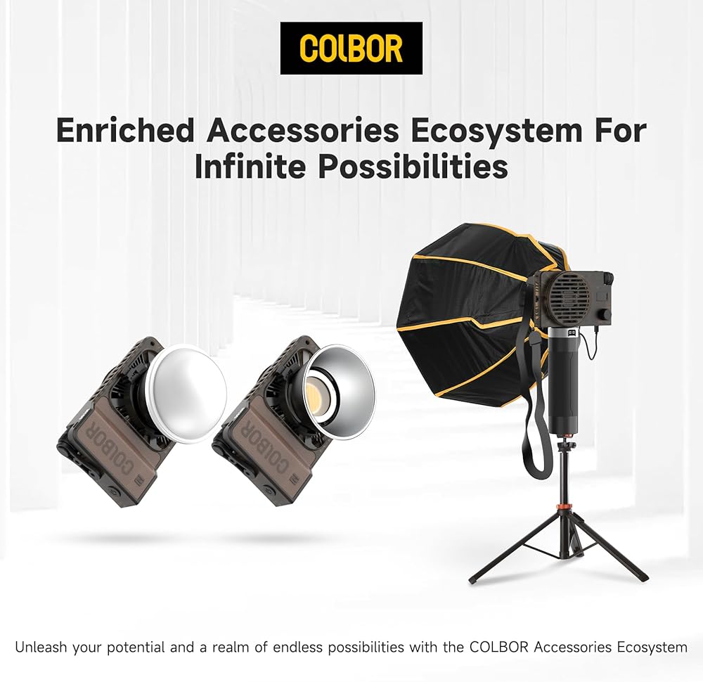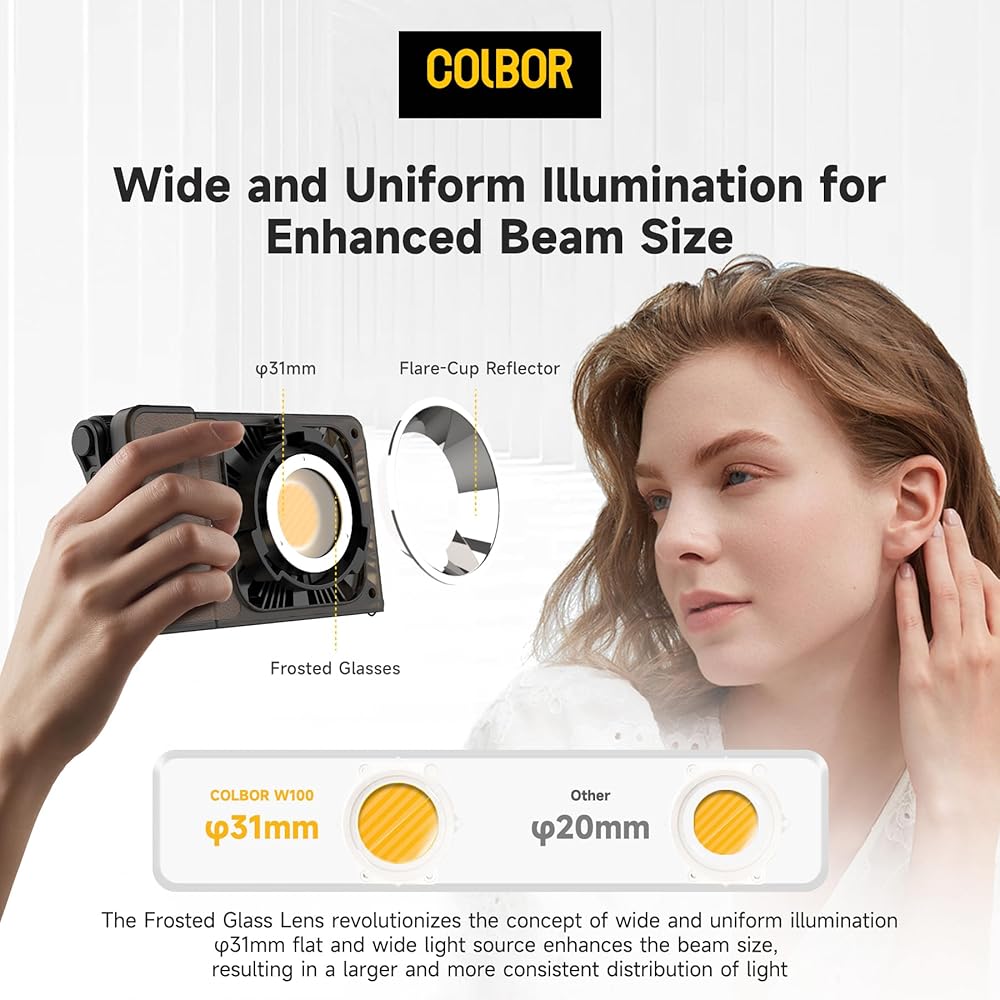 • إضاءة واسعة وموحدة، يوفر Colbor w100 إضاءة تبلغ 3450 لوكس (1 متر، 5600 كلفن). يقدم W100 نطاقًا متنوعًا من درجات حرارة الألوان، يمتد من 2700 كلفن إلى 6500 كلفن، ويتميز بمؤشر CRI مرتفع مثير للإعجاب يبلغ 97+.