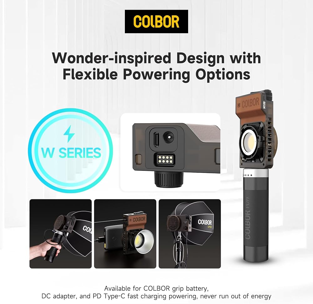 • يوفر W100 مجموعة متنوعة من خيارات الطاقة، مما يوفر الراحة القصوى لاحتياجات الإضاءة الخاصة بك. سواء كان مقبض بطارية COLBOR، أو محول التيار المستمر، أو الشحن السريع PD من النوع C، فلا تنفد الطاقة أبدًا.