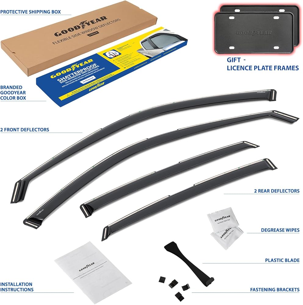 احصل على هدية مثالية الآن - 2 إطار لوحة ترخيص Goodyear متضمن في المجموعة. لا حاجة لأي أدوات، ببساطة قم بتقشير ولصق واقيات المطر هذه على فتحات النوافذ. نقوم بتضمين مناديل إزالة الشحوم لإنجاز المهمة بسرعة. تُعد مظلة التهوية هذه هدية رائعة لعيد الميلاد أو هدية للعطلات لأي شخص يحب القيادة والنافذة لأسفل. تأتي عاكسات النوافذ الجانبية في صندوق ألوان Goodyear محمي بصندوق شحن بني.