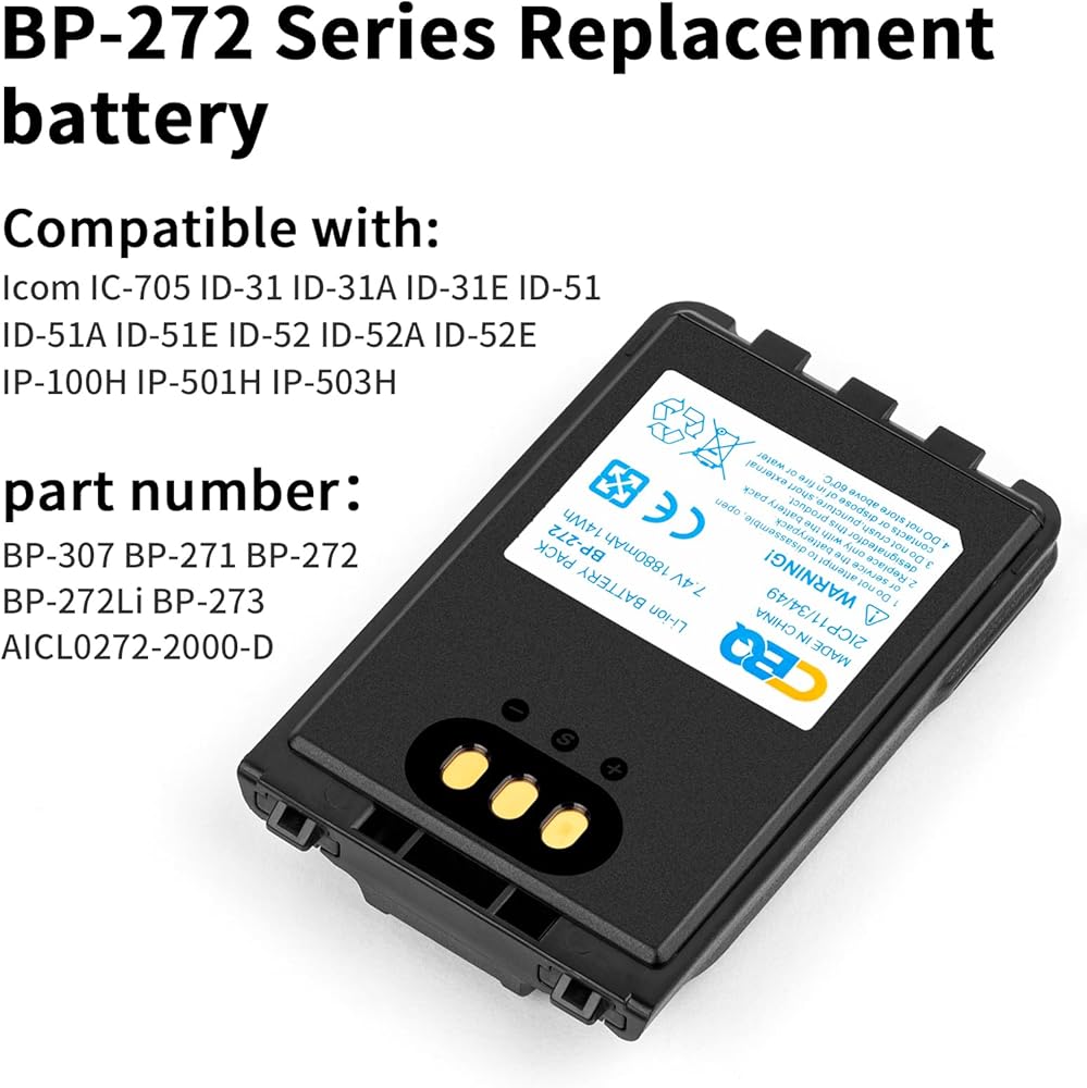 【نموذج متوافق】أفضل بطارية بديلة أصلية، نفس حجم وسمك البطارية الأصلية. متوافقة تماما مع البطارية الخاصة بك. ل Icom IC-705 ID-31 ID-31A ID-31E ID-51 ID-51A ID-51E ID-52 ID-52A ID-52E IP-100H IP-501H IP-503H. أرقام الجزء: BP-307 BP- 271 بي بي-272 بي بي-272 لي بي بي-273 AICL0272-2000-D