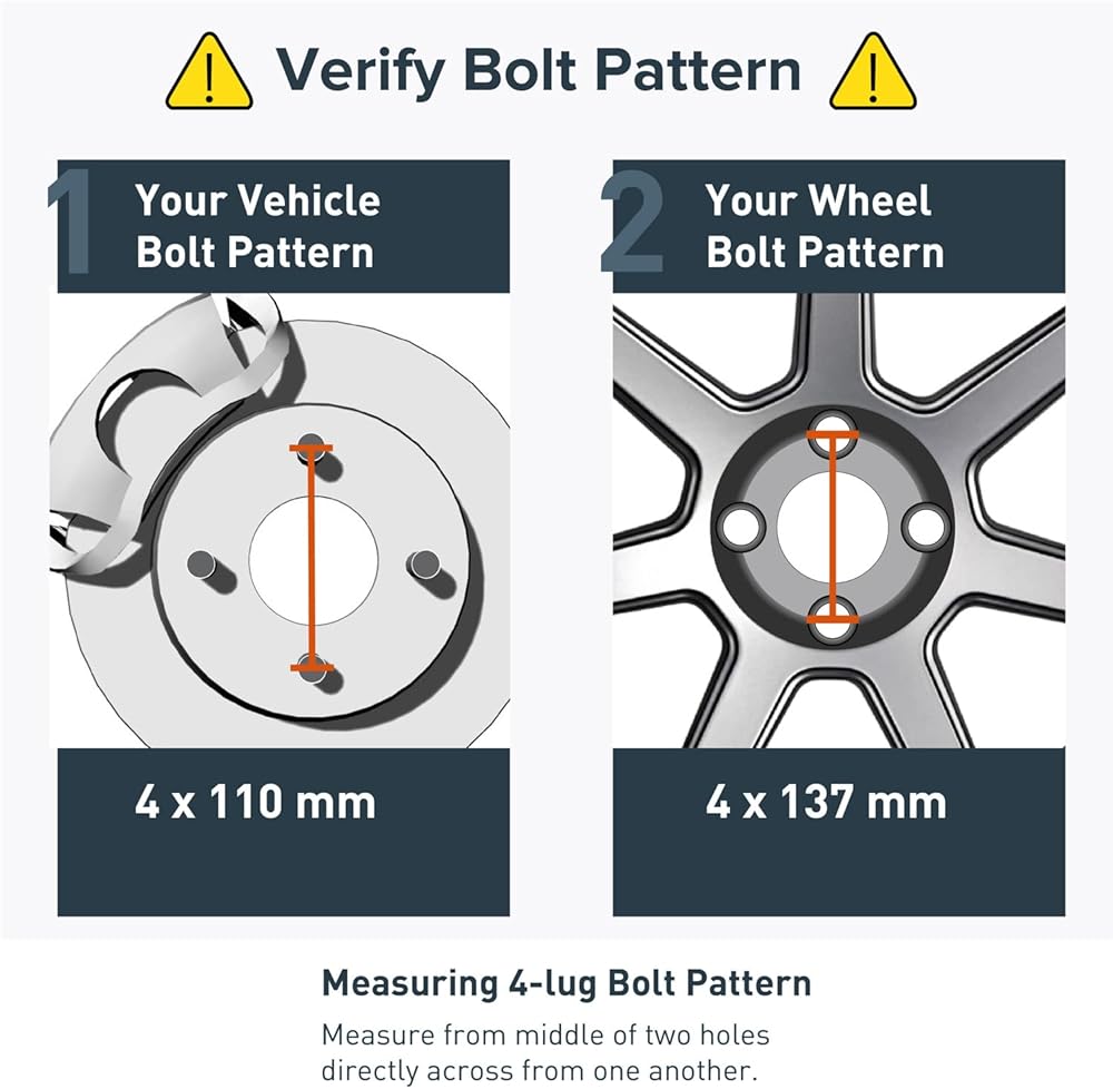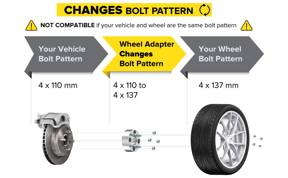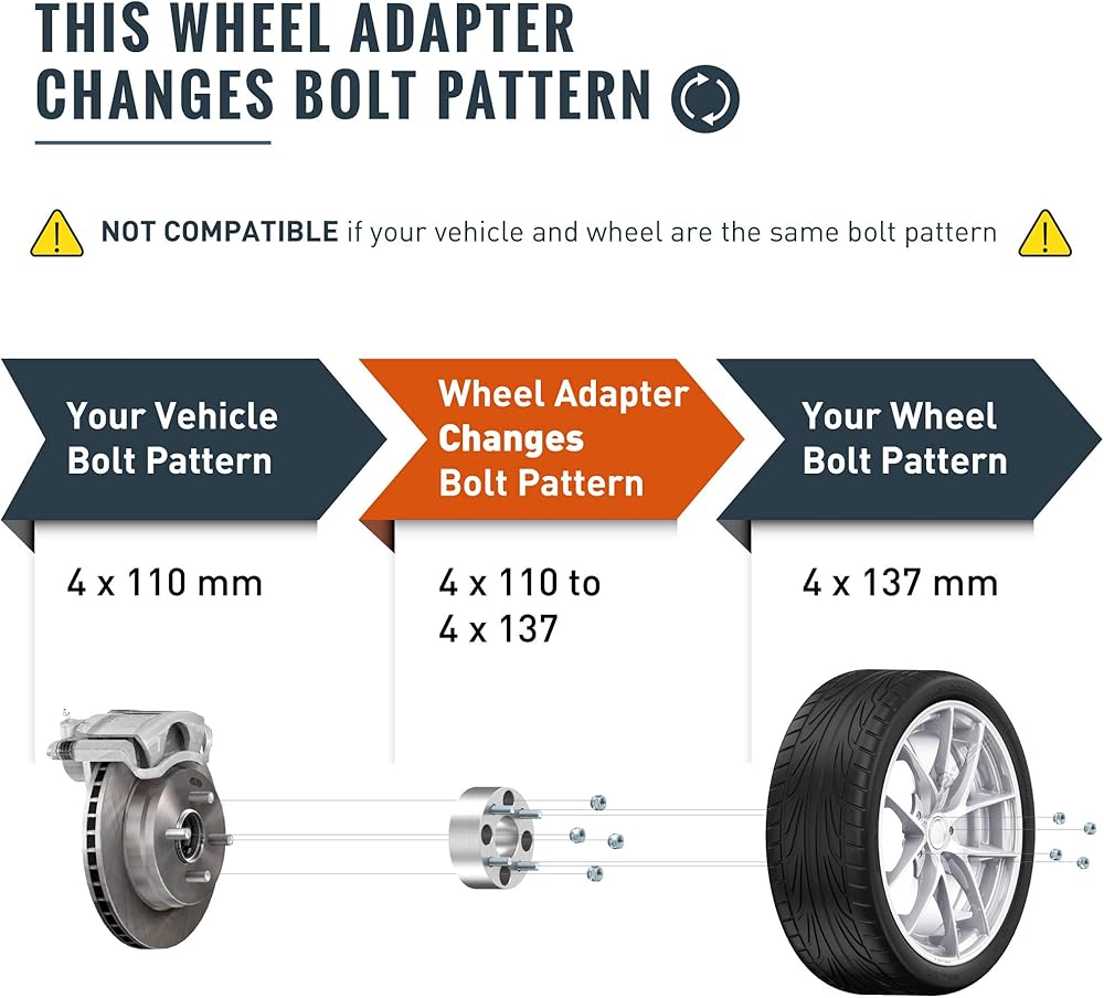 [تغيير نمط الترباس] يجب أن تحتوي السيارة على نمط مسمار 4x110. يجب أن تحتوي العجلة على نمط مسمار 4x137. يحتاج المشترون أيضًا إلى التحقق من: 1) لا يزيد حجم التجويف المركزي للمركبة عن 74.1 مم؛ 2) مسامير العجلة هي M10x1.25 10x1.25mm؛ 3) تكون مسامير العجلات أقصر من 1.0 بوصة (25 مم) طولًا؛ 4) لديك مساحة 1.0 بوصة (25 مم) بين الحاجز والعجلة/الإطار. ملاحظة: هذه هي محولات العجلات التي تختلف عن الفواصل (ليست للعجلات 4x110)
