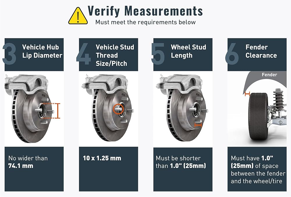 [التركيب] يتطلب أدوات إصلاح الإطارات القياسية، ومفتاح عزم الدوران، ومقبس العروة. في حين أن عملية التثبيت بسيطة ويمكن للمشترين الأكثر خبرة تركيبها بأنفسهم، فإننا نوصي بالتركيب الاحترافي خاصة إذا كانت هذه هي المرة الأولى التي تقوم فيها بتثبيت قطع غيار السيارات. نصيحة هامة تتعلق بالسلامة: صواميل عزم الدوران مطابقة لمواصفات الشركة المصنعة. قم بفحص جميع الأجهزة وإعادة عزم دورانها، بما في ذلك صواميل التثبيت التي تثبت المحول بمحور العجلة بعد مسافة 25-50 ميلاً. راجع الوصف للحصول على معلومات التثبيت الإضافية.