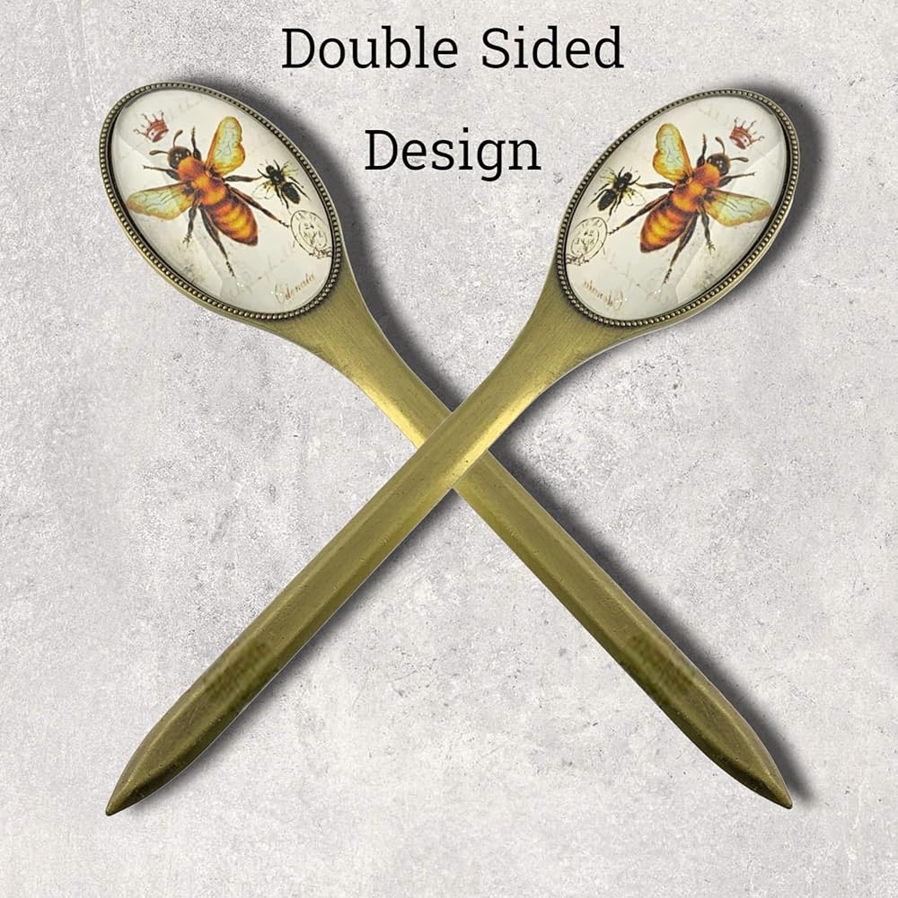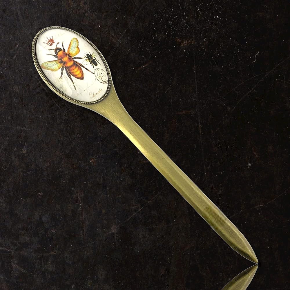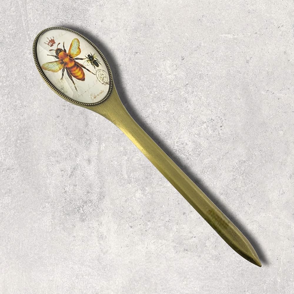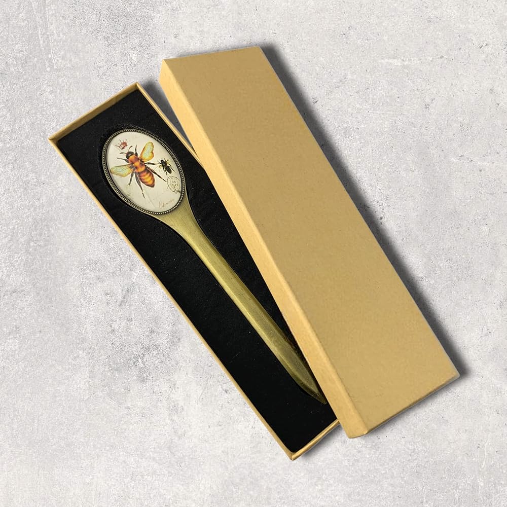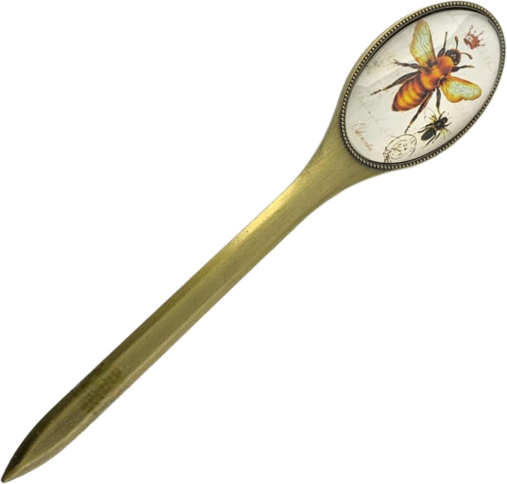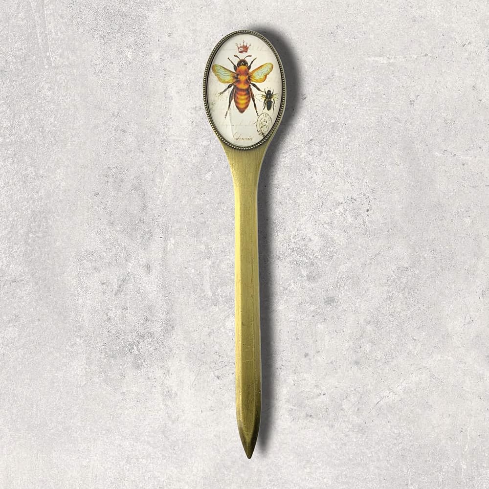 Premium Quality: Durable antiqued brass blade, the double-sided handle features an image of a honey bee & crown beneath a glass cover.