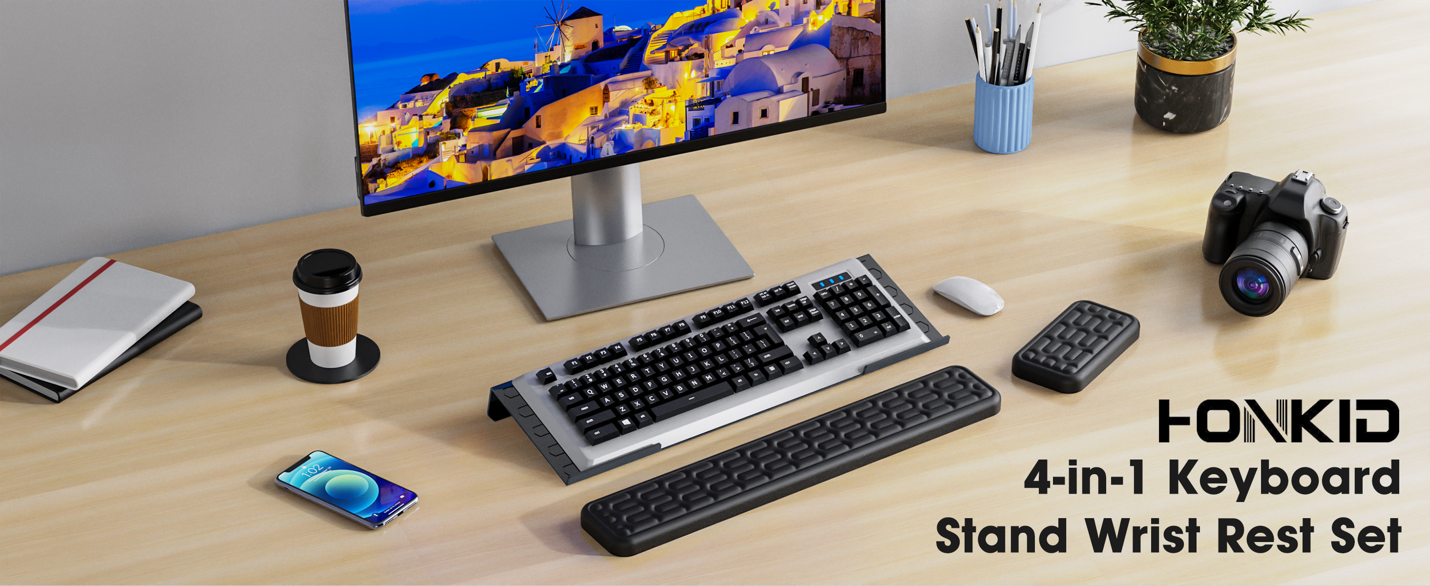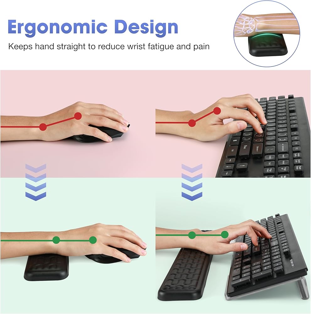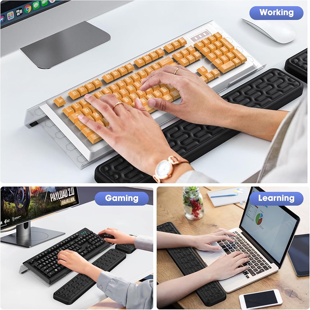 تخفيف آلام المعصم. تم تصميم حامل لوحة مفاتيح الكمبيوتر لسطح المكتب ومساند المعصم بشكل مريح، وتم رفعه بشكل صحيح بمقدار 1 بوصة للحفاظ على وضع المعصم المستقيم، والذي يمكن أن يحمي المعصم أو اليد بشكل فعال أثناء العمل المكثف أو الألعاب.