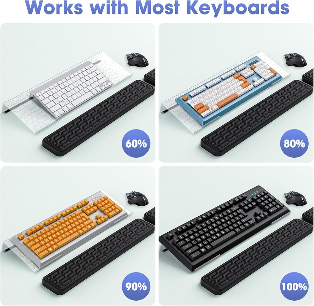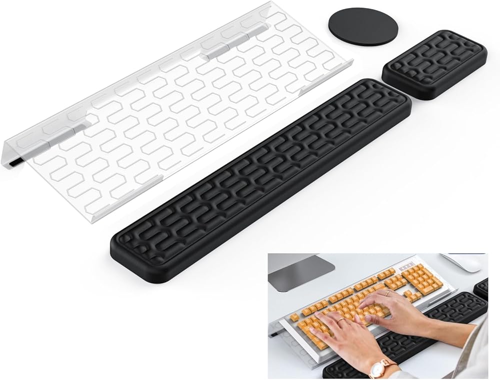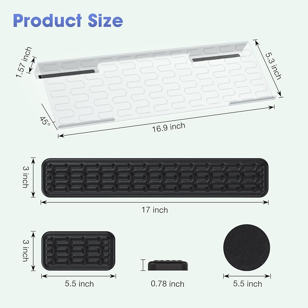 مواد عالية الجودة. حامل لوحة مفاتيح الكمبيوتر مصنوع من الأكريليك مع حواف وزوايا مصقولة، مما يمنحه مظهرًا أنيقًا وأنيقًا. مسند المعصم مصنوع من رغوة الذاكرة لتوفير أقصى قدر من الراحة والتهوية.
