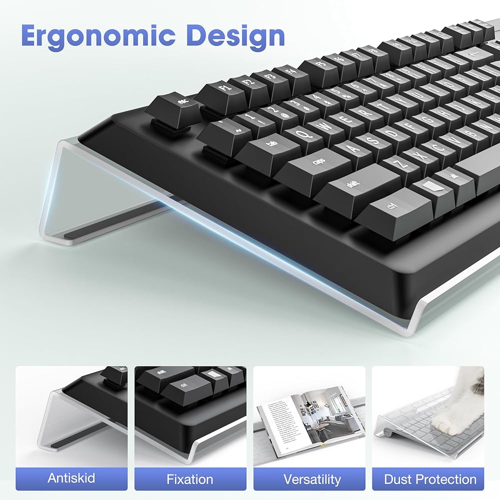 يناسب لوحات المفاتيح المختلفة. حامل لوحة المفاتيح الأكريليك، مقاس 16.9*5.5 بوصة، متوافق مع معظم لوحات المفاتيح، بما في ذلك لوحة المفاتيح القياسية، ولوحة المفاتيح الرفيعة، ولوحة المفاتيح السحرية، ولوحة المفاتيح الميكانيكية، ولوحة المفاتيح الصغيرة، ولوحة المفاتيح كاملة الحجم.