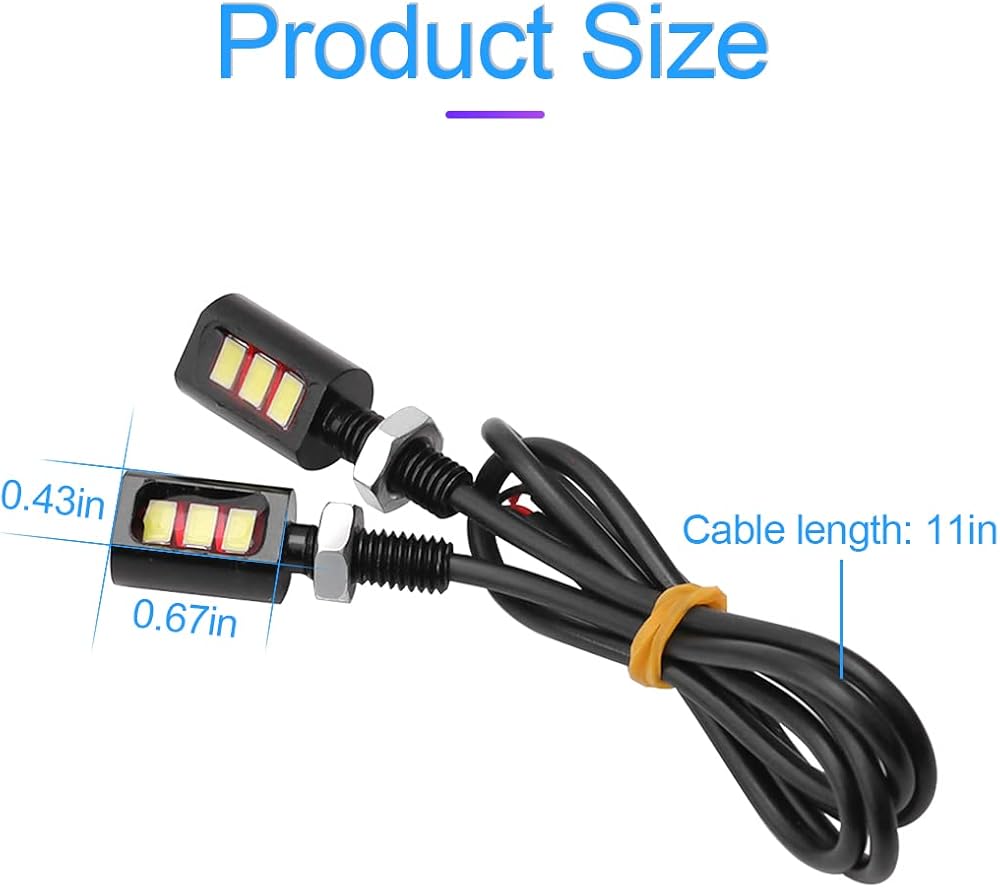السطوع-نطاق جهد العمل 12-15 فولت. الطاقة: 0.6 واط. طول السلك: 270 ملم. مقاس كل ضوء 12 مم × 34 مم (الطول × العرض). التدفق المضيء: 60 لومن لكل لمبة، أداء فائق السطوع ومقاوم للماء يسمح للسائق بالقيادة في يوم ممطر أو ثلجي بأمان مع رؤية أفضل. يرجى ملاحظة: لا تستخدم أكثر من 15 فولت تيار مستمر وإلا سيحترق الضوء بسهولة، يرجى استخدامه بعناية لضمان السلامة.