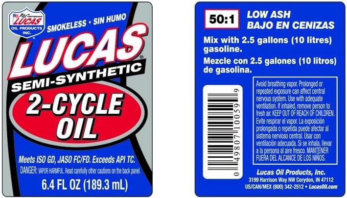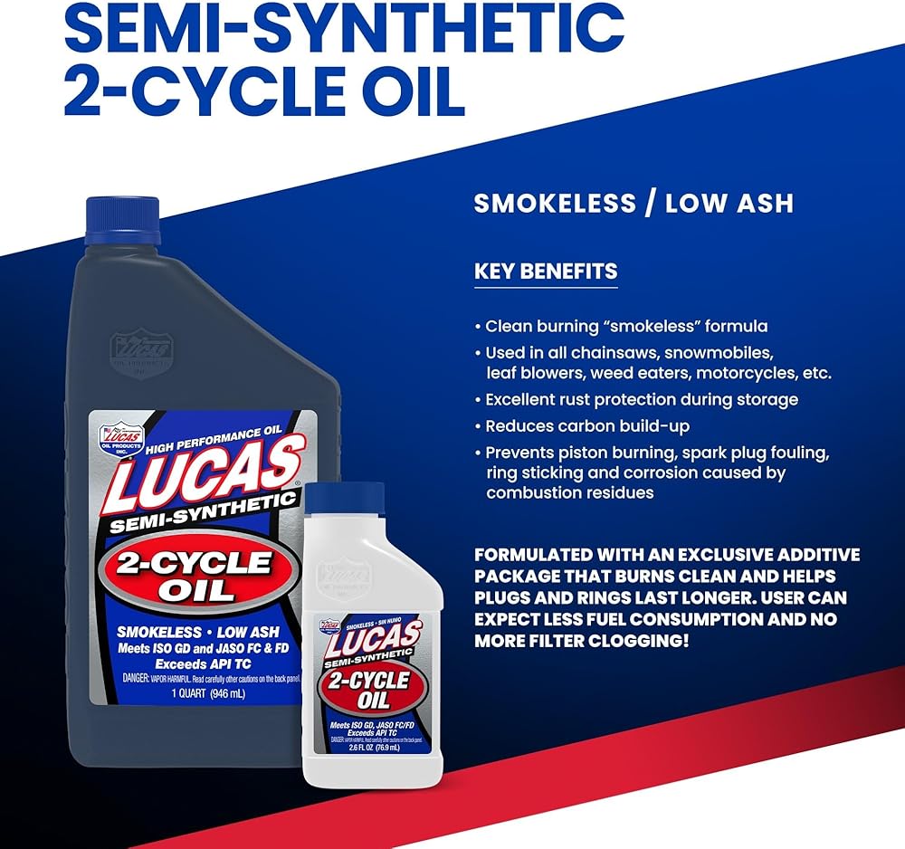 Lucas High Performance Semi-Synthetic 2-Cycle Oil has been specifically developed to give a long trouble-free life to gasoline-powered 2-cycle engines. Designed for any oil injection system or pre mix up to 50:1. Use in Snowmobiles, Weed Eaters, Leaf Blowers, Chain Saws and more.