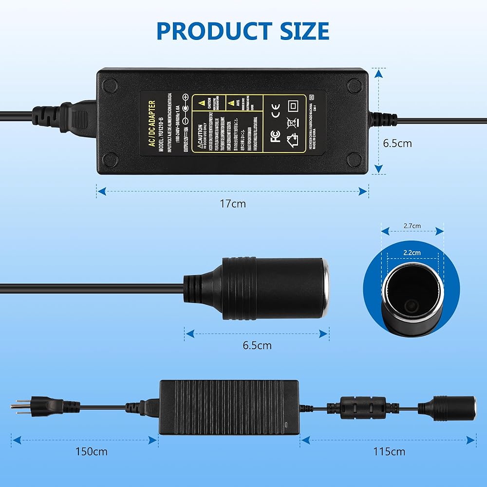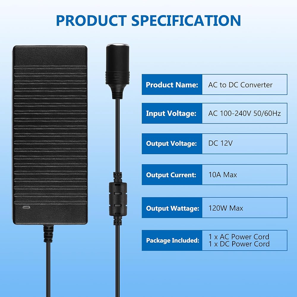 ✅【محول تيار متردد إلى تيار مستمر】: الإدخال: تيار متردد 100-240 فولت 50/60 هرتز؛ الإخراج: تيار مستمر 12 فولت 10 أمبير (120 واط كحد أقصى)؛ طول الكابل: 8.7 قدم/265 سم. يعمل مع أجهزة السيارة تحت 10A. لا تتجاوز 120 واط على محول ولاعة السجائر هذا.