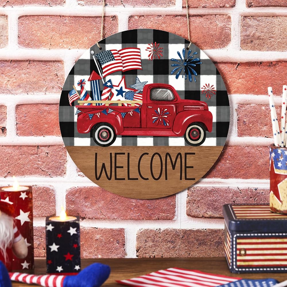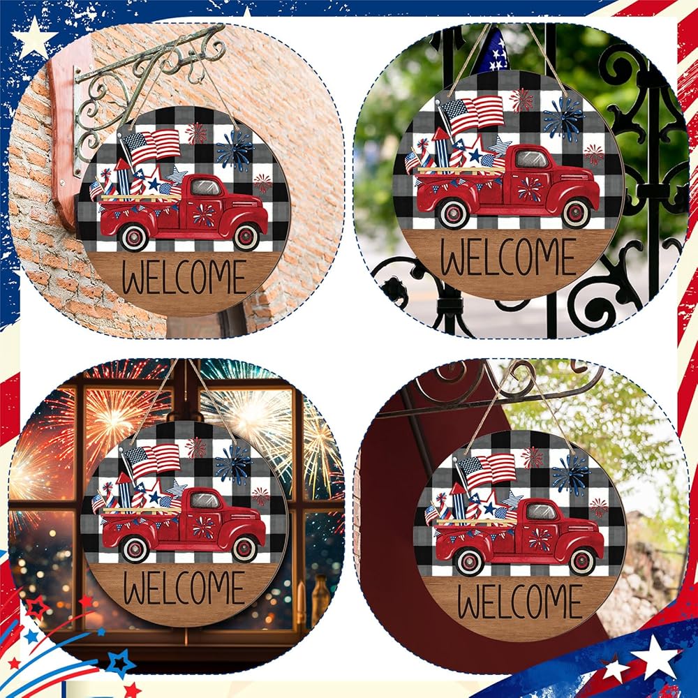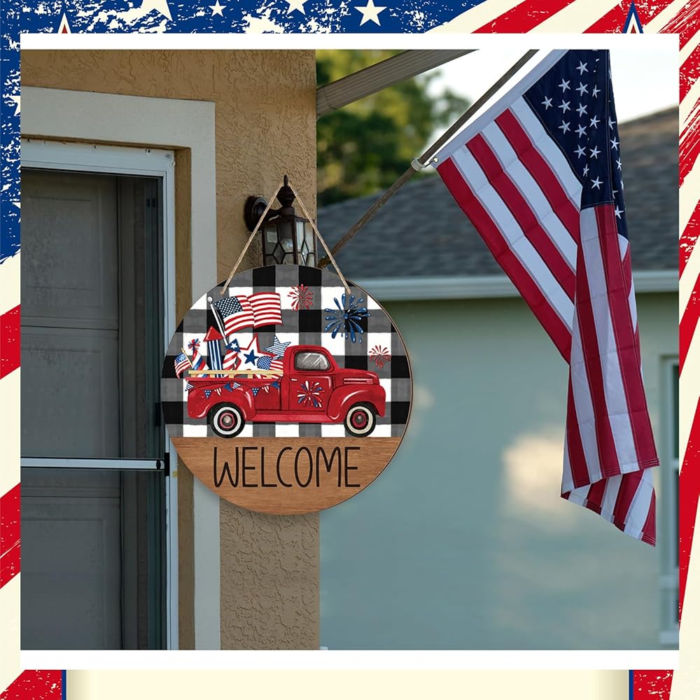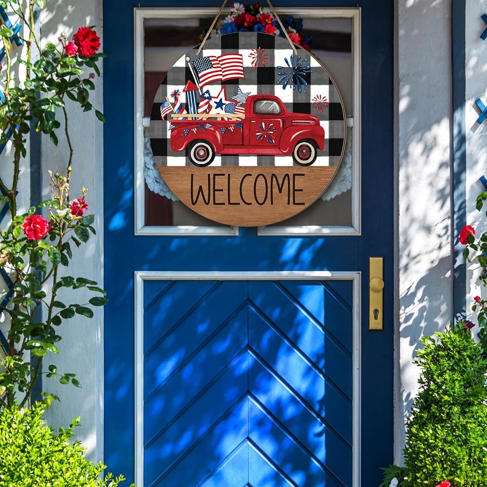 علامة ترحيب في الرابع من يوليو، ديكور ريفي وطني للباب الأمامي، علامة جدار يوم الذكرى، أحمر أبيض، أزرق، إكليل، شاحنة العلم الأمريكي، ديكور يوم الاستقلال لجدار الباب، الشرفة الخارجية