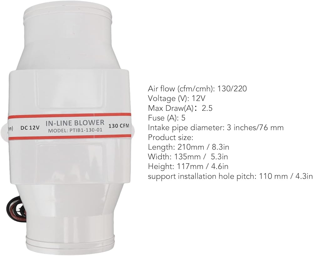 2. High Efficiency: This 12v in line blower is very efficient and energy saving, with very low current consumption, high volume air and service life