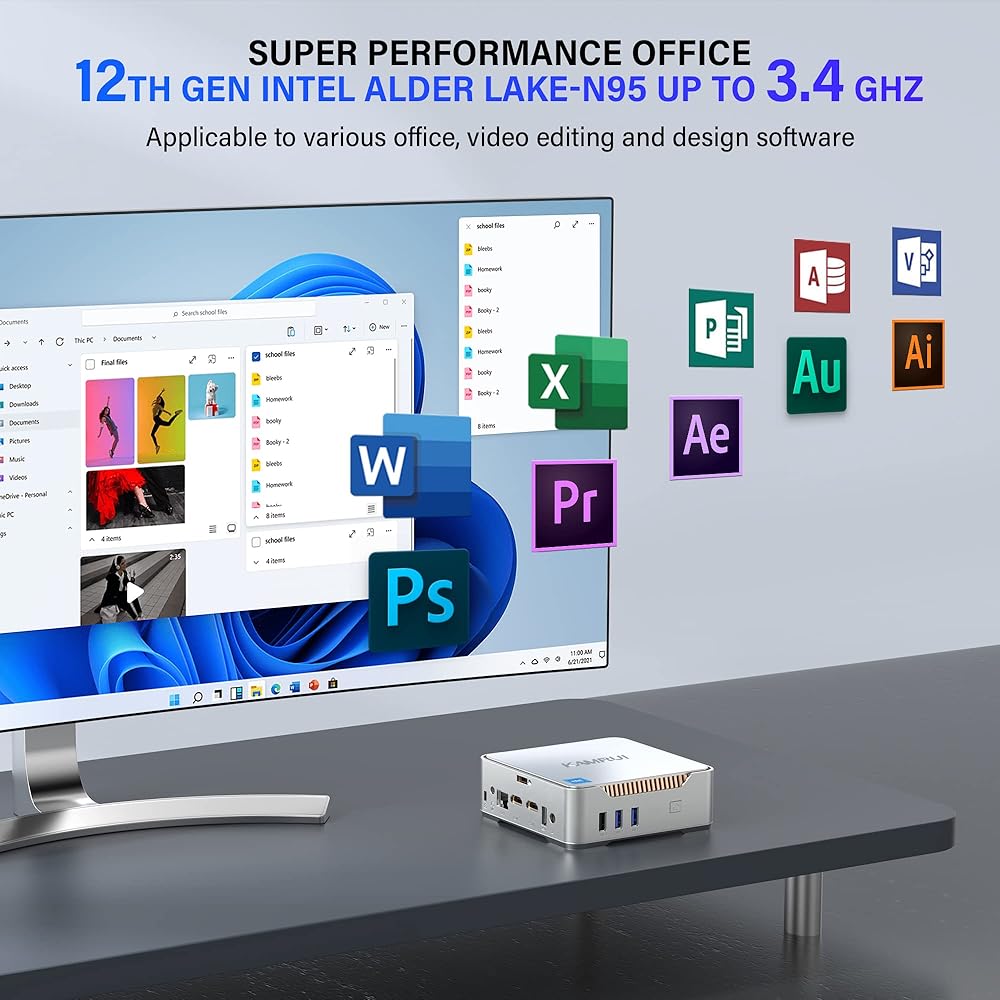 KAMRUI Mini PC، Intel Alder Lake الثاني عشر - N95 حتى 3.4 جيجا هرتز، ذاكرة وصول عشوائي 16 جيجا بايت + 1 تيرابايت M.2 SSD، كمبيوتر صغير يدعم 2.5 بوصة SATA SSD، WiFi 2.4G/5G، Bluetooth4.2، شاشة ثلاثية، كمبيوتر مكتبي صغير موثوق بدقة 4K