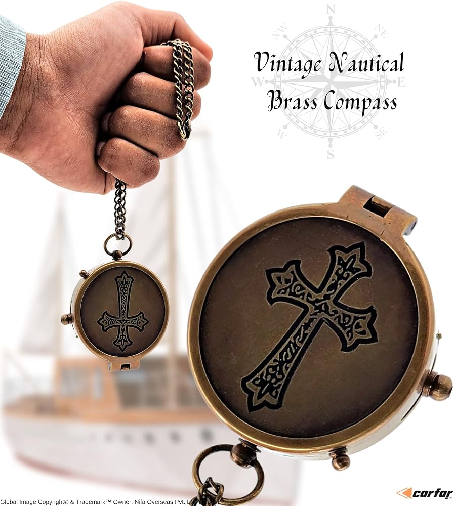 بوصلة بحرية على شكل صليب يسوع منقوش عليها بوصلة ملاحية بحرية عتيقة من النحاس الصلب مع صندوق خشبي