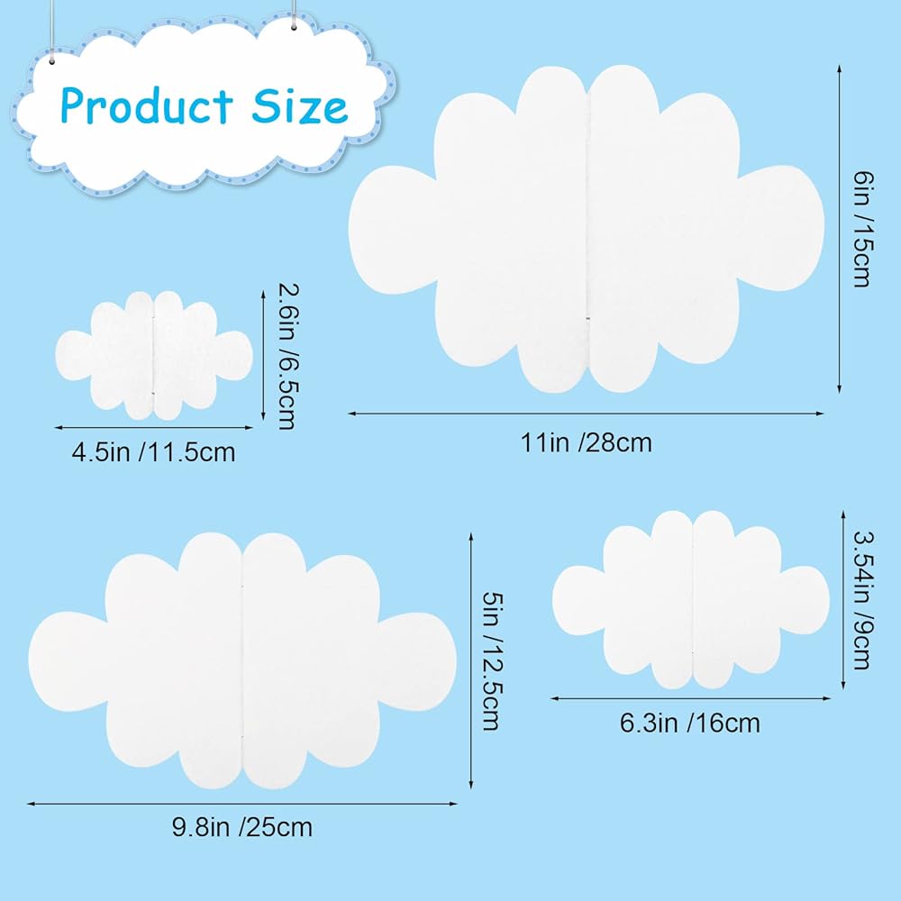 ☁【4 Sizes in 8 Pieces】You will receive 8 pieces of ceiling cloud decoration in 4 sizes: 4.5 * 2.6 "/11.5 * 6.5 cm, 6.3 * 3.54"/16 * 9 cm, 9.8 * 5 "/25 * 12.5 cm, 11 * 6"/28 * 15 cm. Different sizes can meet your different needs in different occasions.