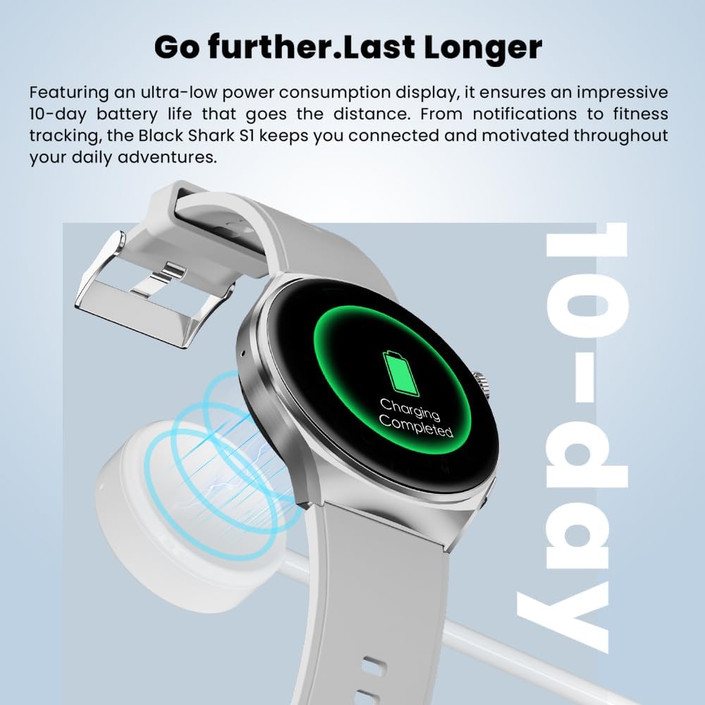 [عمر بطارية يدوم 10 أيام] - مع شاشة عرض منخفضة للغاية لاستهلاك الطاقة، تضمن عمر بطارية مثير للإعجاب يدوم 10 أيام لمسافة طويلة. من الإشعارات إلى تتبع اللياقة البدنية، يبقيك Black Shark S1 على اتصال وتحفيز أثناء مغامراتك اليومية.
