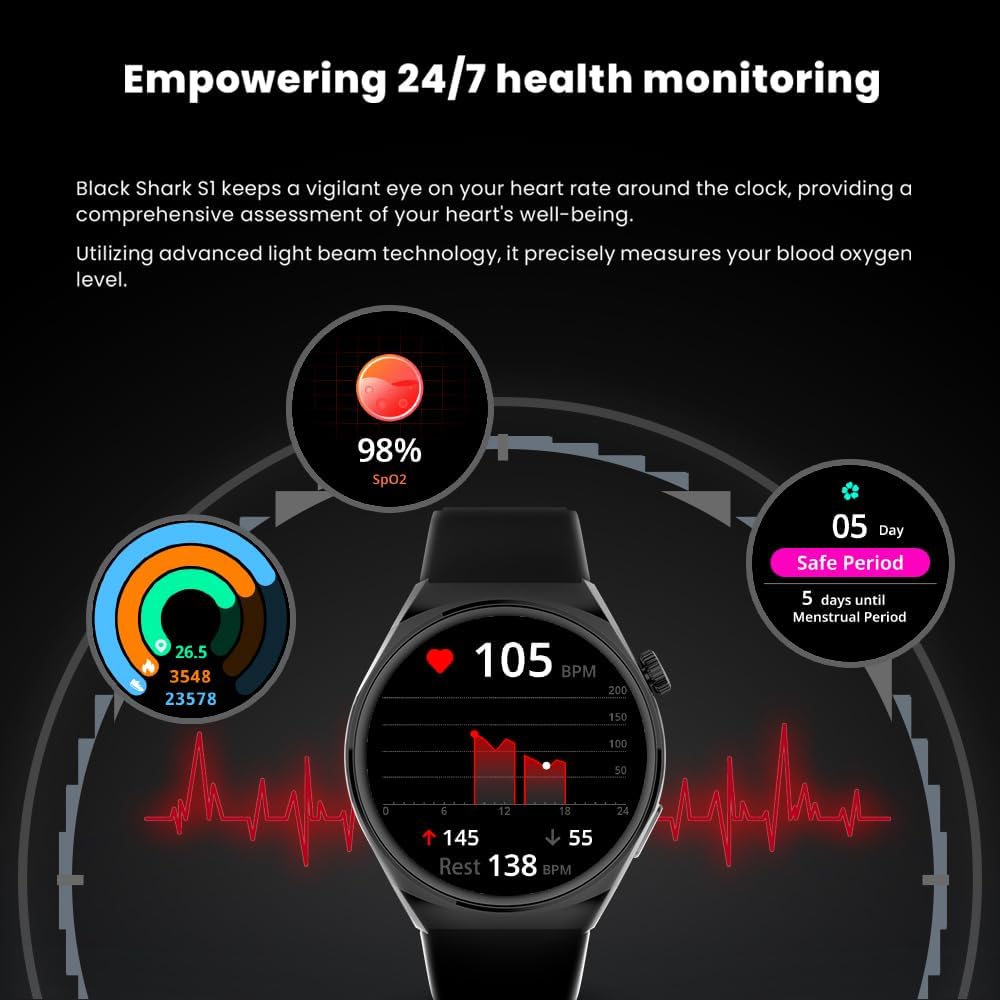 [مراقبة الصحة على مدار 24 ساعة] - يراقب Black Shark S1 معدل ضربات قلبك طوال اليوم، مما يوفر تقييمًا شاملاً لرفاهية قلبك. باستخدام تقنية شعاع الضوء المتقدمة، فإنه يقيس مستوى الأكسجين في الدم بدقة.