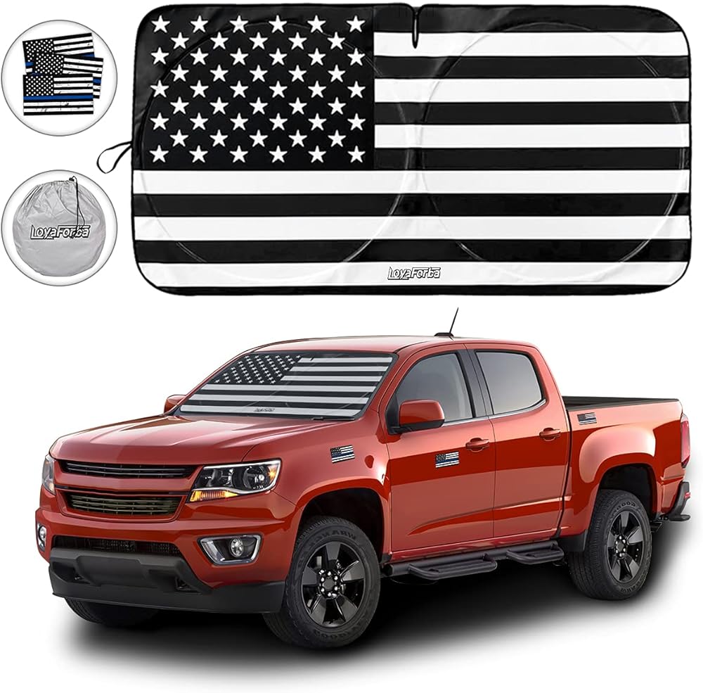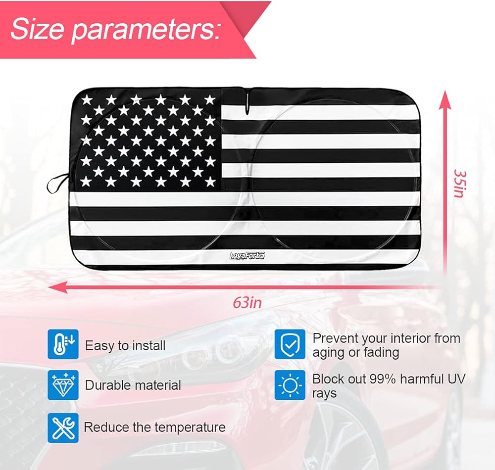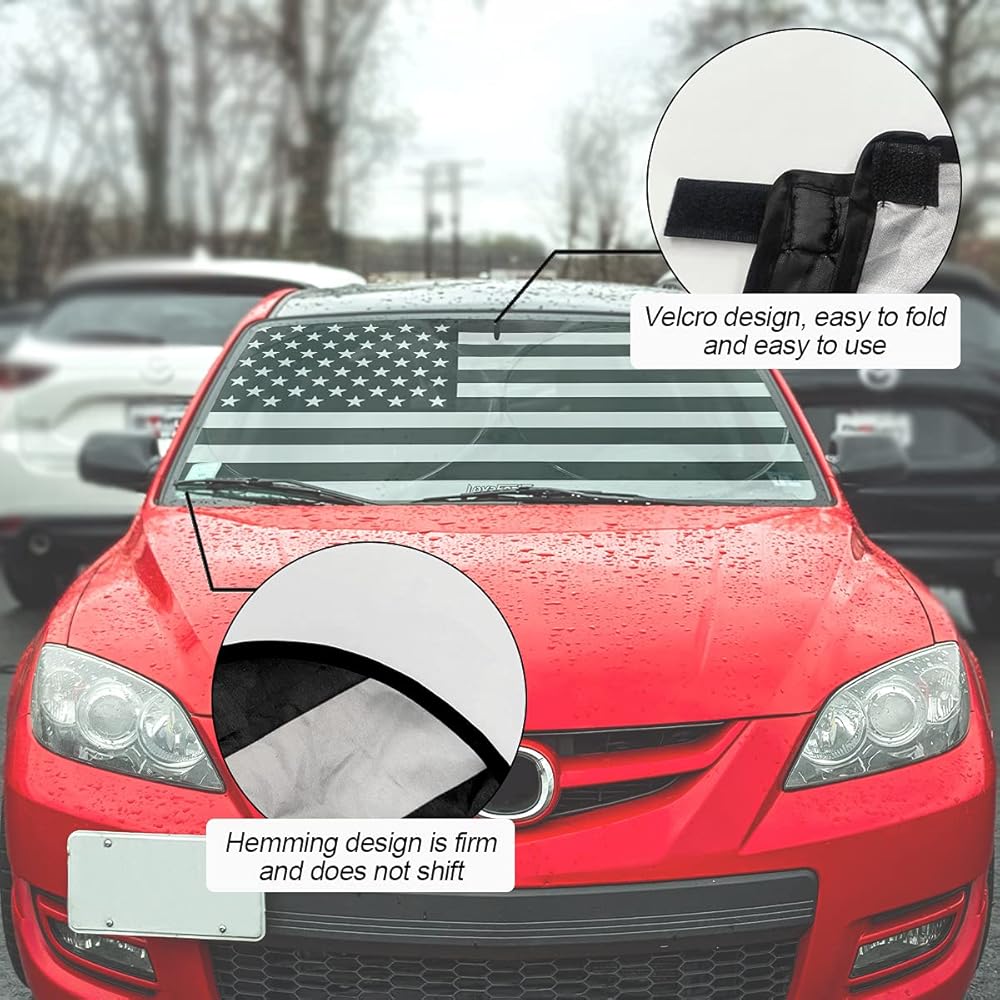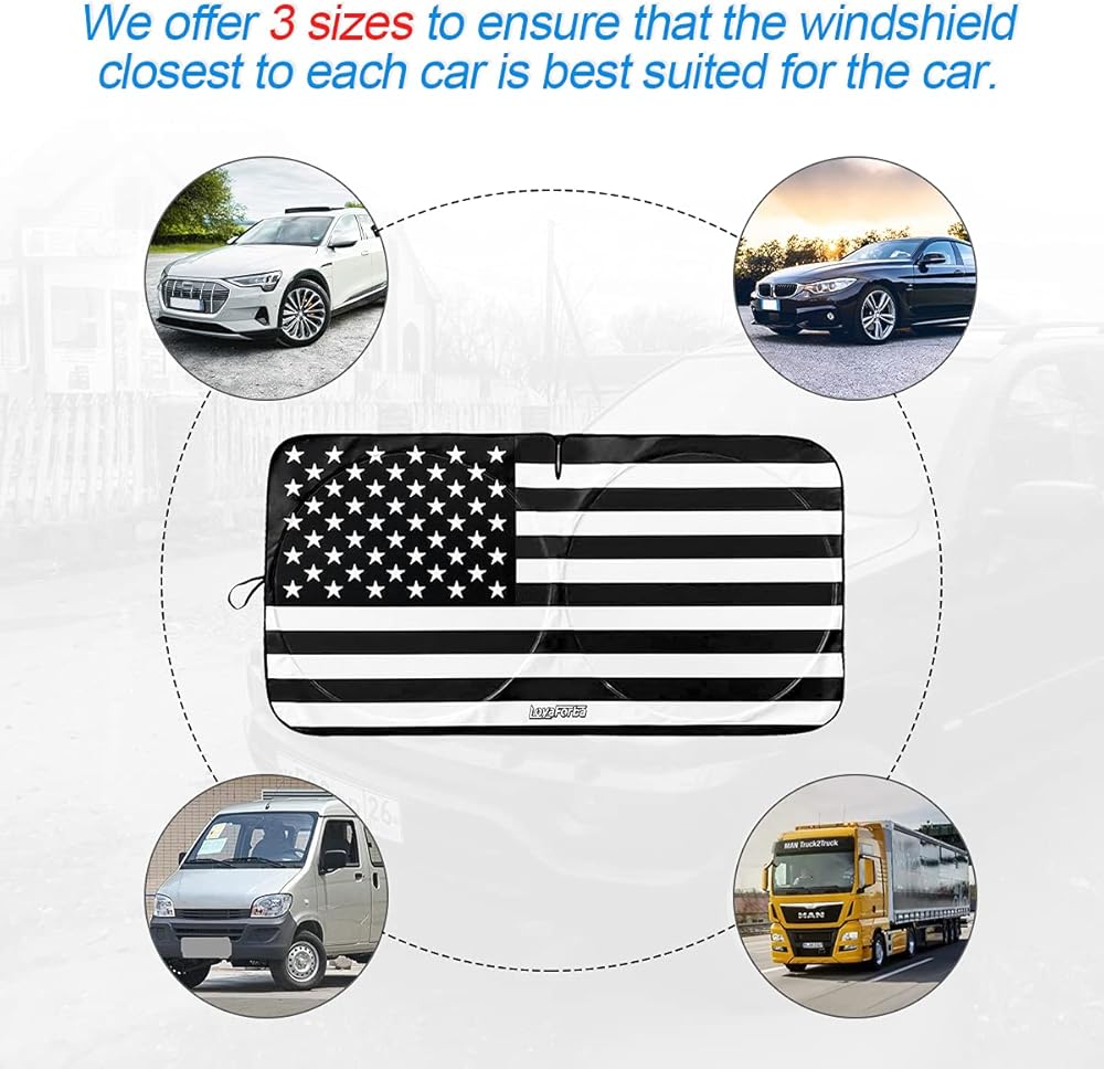 مظلة شمسية للزجاج الأمامي للسيارة، واقي من الشمس لعجلة قيادة العلم الأمريكي للسيارة، والأشعة فوق البنفسجية وحماية الخصوصية، قابلة للطي، تحافظ على برودة السيارة، مناسبة لمعظم المركبات (أسود، 59 بوصة × 27 بوصة)