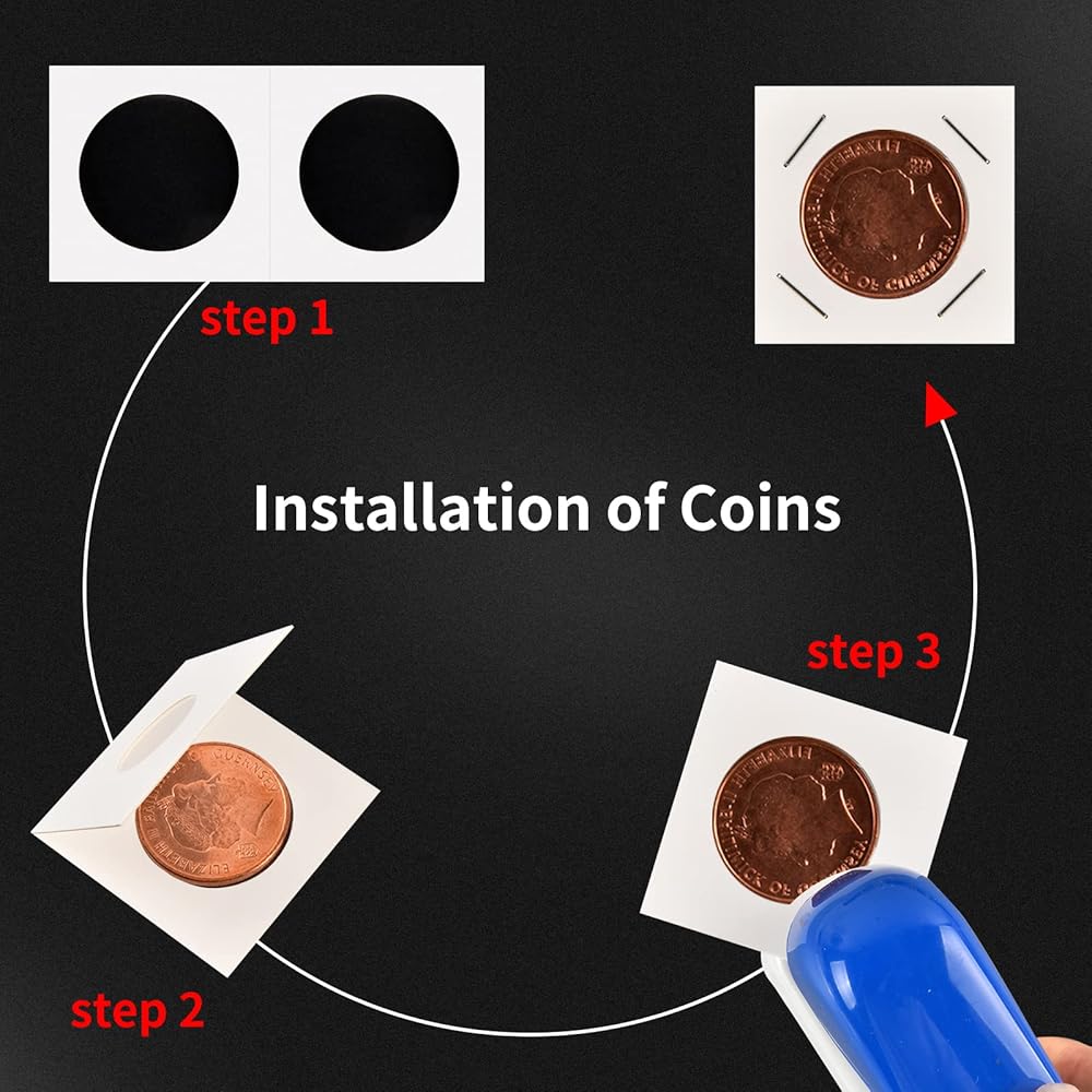 كيفية الاستخدام - تحتوي كل حافظة للعملات المعدنية على نافذة واضحة لسهولة رؤية العملات المعدنية وتحديدها. ما عليك سوى طي المشبك والدبابيس لإغلاقه وحماية عملاتك المعدنية من التلف. يمكنك أيضًا كتابة تفاصيل مهمة حول عملاتك المعدنية، مثل الحجم والسنة والمواد، على الجزء الخارجي من حامل العملات المعدنية لهواة التجميع لسهولة التنظيم.